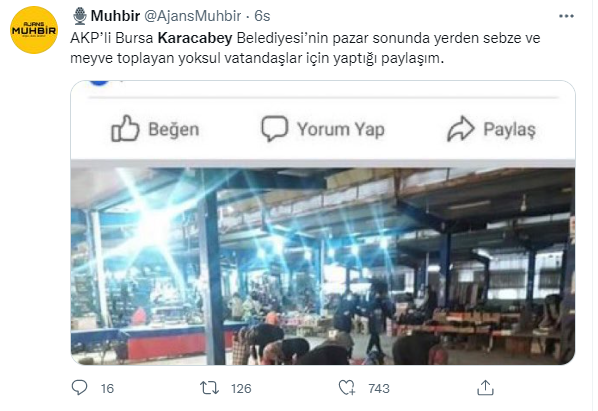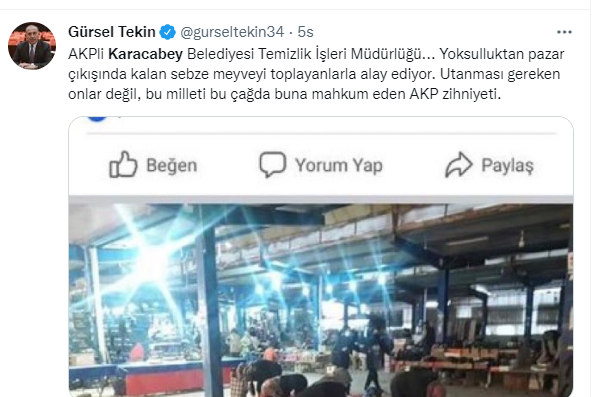 AKPli Karacabey Belediyesi Temizlik İşleri Müdürlüğü… Yoksulluktan pazar çıkışında kalan sebze meyveyi toplayanlarla alay ediyor. Utanması gereken onlar değil, bu milleti bu çağda buna mahkum eden AKP zihniyeti.
