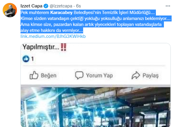 Pek muhterem Karacabey Belediyesi’nin Temizlik İşleri Müdürlüğü… Kimse sizden vatandaşın çektiği yokluğu yoksulluğu anlamanızı beklemiyor… Ama kimse size, pazardan kalan artık yiyecekleri toplayan vatandaşlarla alay etme hakkını da vermiyor…