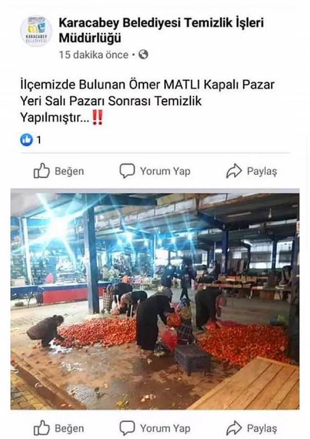 AK Partili’li Ali Özkan’ın Karacabey Belediyesi’nin Sosyal Medya Hesabından Yaptığı Skandal Paylaşım. AK Parti’li Karacabey Belediyesi’nin Temizlik İşleri Müdürlüğü’ne ait Facebook hesabından pazar artıklarını toplayan vatandaşlar paylaşıldı. Fotoğrafa yazılan not tepki çekti. Türkiye ayağa kalktı.