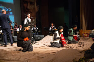 BURSA – Şefliğini Türk Halk Müziği Bölümü sanatçı ve öğretmenlerinden Hamit Gazigil’in üstlendiği; içerisinde tiyatral gösterimlerle dönem ruhunun da yansıtıldığı gecede; sunumdan orkestraya, koristlerden solistlere kadar sahnede yer alan ekip tamamıyla Türk Halk Müziği Bölümü öğrencilerinden oluştu.