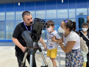 GUHEM’de düzenlenen özel etkinlikte bilim iletişimcileri eşliğinde atölye çalışmaları, interaktif sunumlar, teleskopla gözlem ve deneyler gerçekleştirildi. Programa kızı ile birlikte katılan Emine Kesici