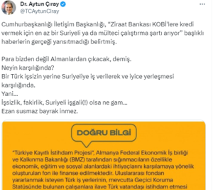 EKONOMİ – Aytun Çıray dün çıkan Ziraat Bankası’ndan Türk patrona Suriyeli çalıştırma şartı başlıklı haberlere dezenformasyon diyen İletişim Başkanlığına tepki göstererek: ”Para bizden değil Almanlardan çıkacak, demiş. Neyin karşılığında? Bir Türk işsizin yerine Suriyeliye iş verilerek ve iyice yerleşmesi karşılığında. Yani… İşsizlik, fakirlik, Suriyeli işgali(!) olsa ne gam… Ezan susmaz bayrak inmez.” dedi.