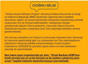 Ziraat Bankası’nın, finansmana erişimin çok zorlaştığından şikayet eden küçük ve orta büyüklükteki işletmelere (KOBİ), 1,5 milyon lira kredi desteği vereceği, ancak bu krediyi alabilmek için Suriyeli işçi ya da bir mülteci çalıştırma şartı aranacağı iddia edildi.