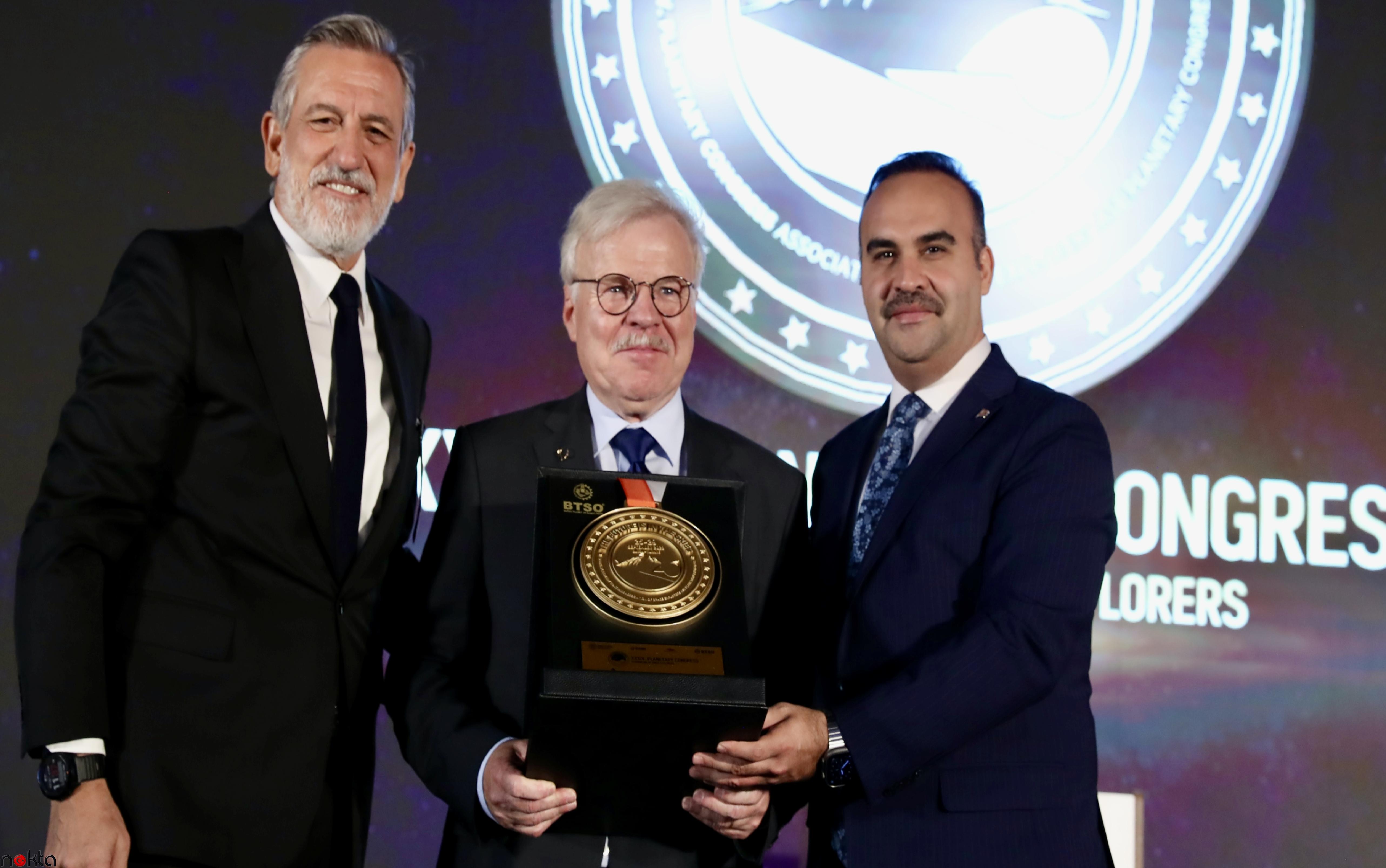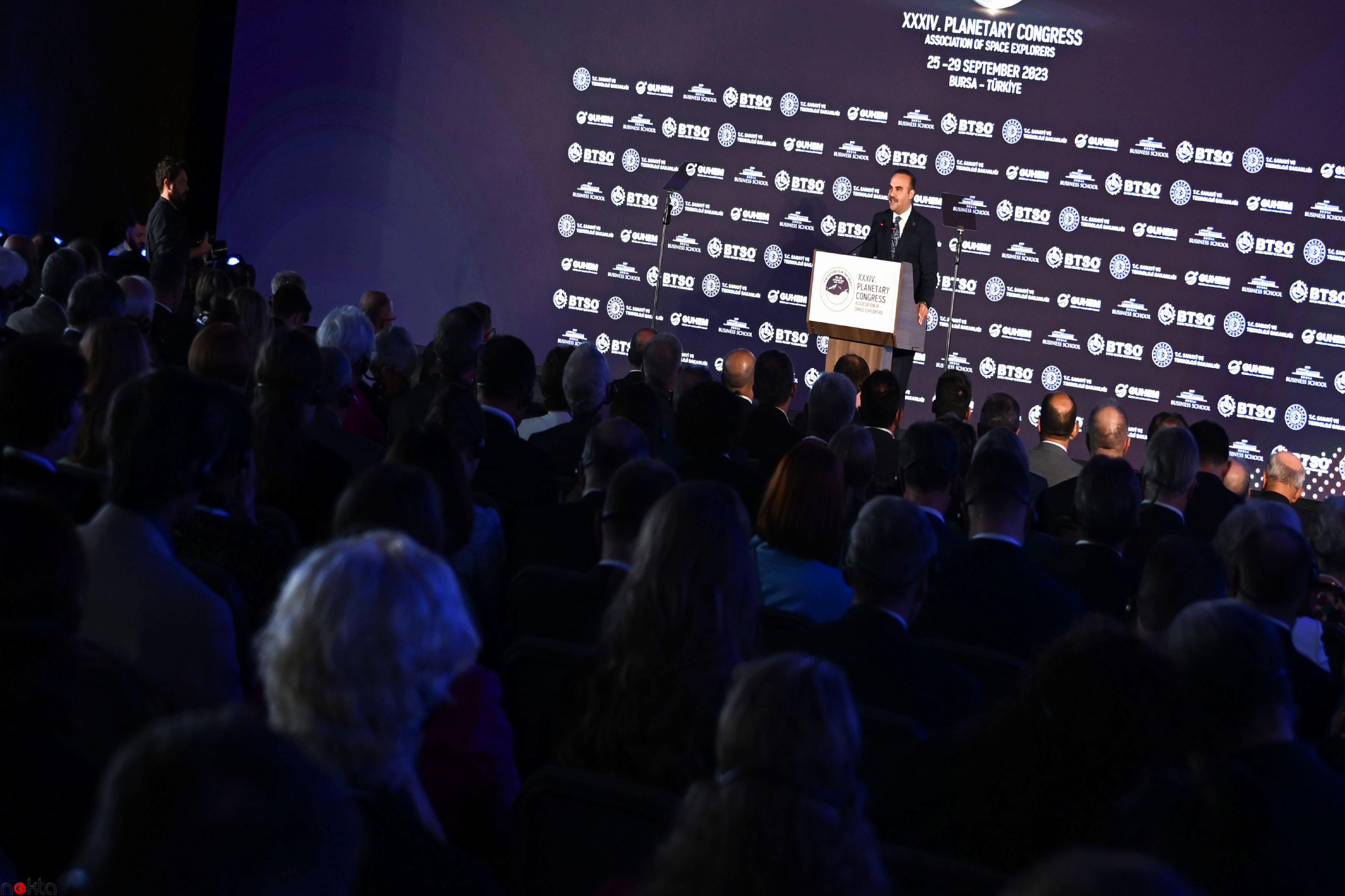 “Türk astronot ve bilim misyonu kapsamında ülkemizin beşerli birinci uzay vazifesini planladık. Memleketler arası Uzay İstasyonu’na gidecek birinci Türk uzay yolcumuz tıptan materyal bilimine kadar 13 farklı bilimsel deneyi icra edecek. Hala eğitimleri devam eden birinci Türk uzay yolcularımız, Bursa’nın sevdiği tabirle gökmenlerimiz, bu programda bizlerle birlikteler. Burada huzurlarınızda 70’e yakın astronot ve kozmonota konut sahipliği yaptığımız bu toplantıda birinci Türk uzay yolcuları Alper Gezeravcı ve Tuva Cihangir Atasever’i de daima birlikte alkışlayalım. Onlara cüret verelim. İnşallah kısa vakitte gerçekleştirilecekleri bu misyonla onlar da bu büyük insanlık ailesinin yeni bir adımını atacaklar. Türkiye’yi bu topluluğun bir modülü yapmak ismine kıymetli bir unsur imza atacaklar ve uzun yıllar boyunca Türk gençlerinin, Türk çocuklarının ve pek çok ülkenin gençlerinin ve çocuklarının sizler üzere onlar da ilham kaynağı olacaklar.”