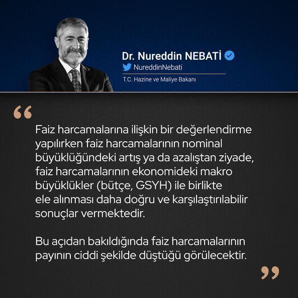 Bakan Nebati: Türkiye borçla faizle değil yatırımla üretimle büyüyor Hazine ve Maliye Bakanı Nureddin Nebati, Twitter üzerinden faiz harcamalarına ilişkin önemli açıklamalarda bulundu. Bakan Nebati açıklamasında şu ifadeleri kullandı: “2002 yılında her 100 TL’lik bütçe harcamasının 43,2 TL’si faiz ödemelerine gidiyordu. 2021 yılında 11,3 TL’si, 2022 yılında ise yalnızca 10,6 TL’si faiz ödemelerinde kullanıldı.