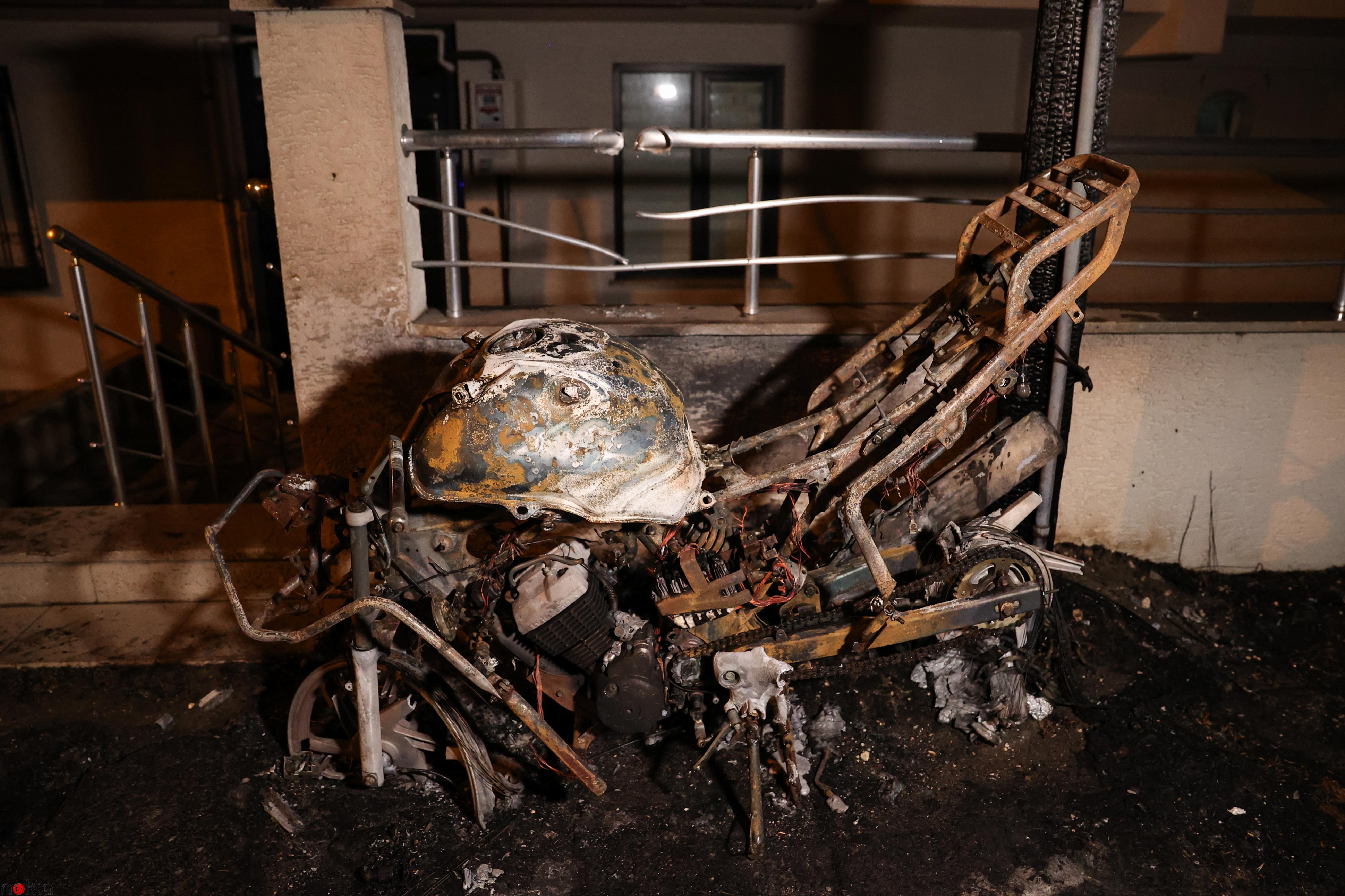 Çıkan yangın nedeniyle bina önünde park halinde bulunan motosiklet kullanılmaz hale geldi.