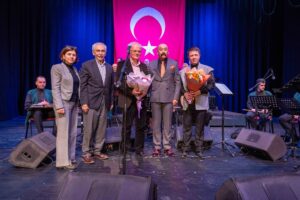 Gecenin sonunda, Mustafa Özçelik ve İlker Cansevdi’ye çiçeklerini Büyükşehir Belediyesi Başkanvekili Fethi Yıldız ile Orkestra Şube Müdürü Muhterem Çevik takdim etti.
