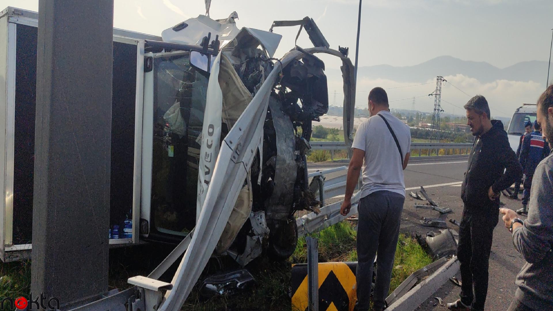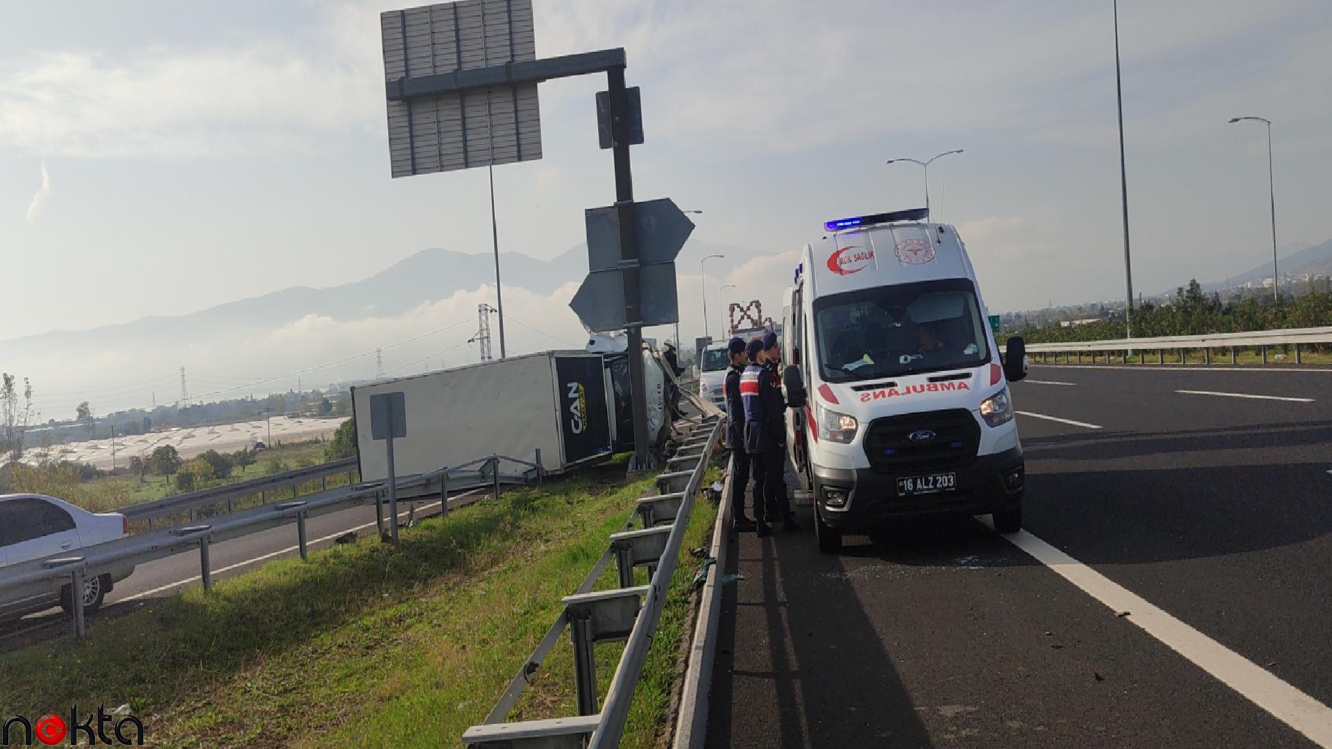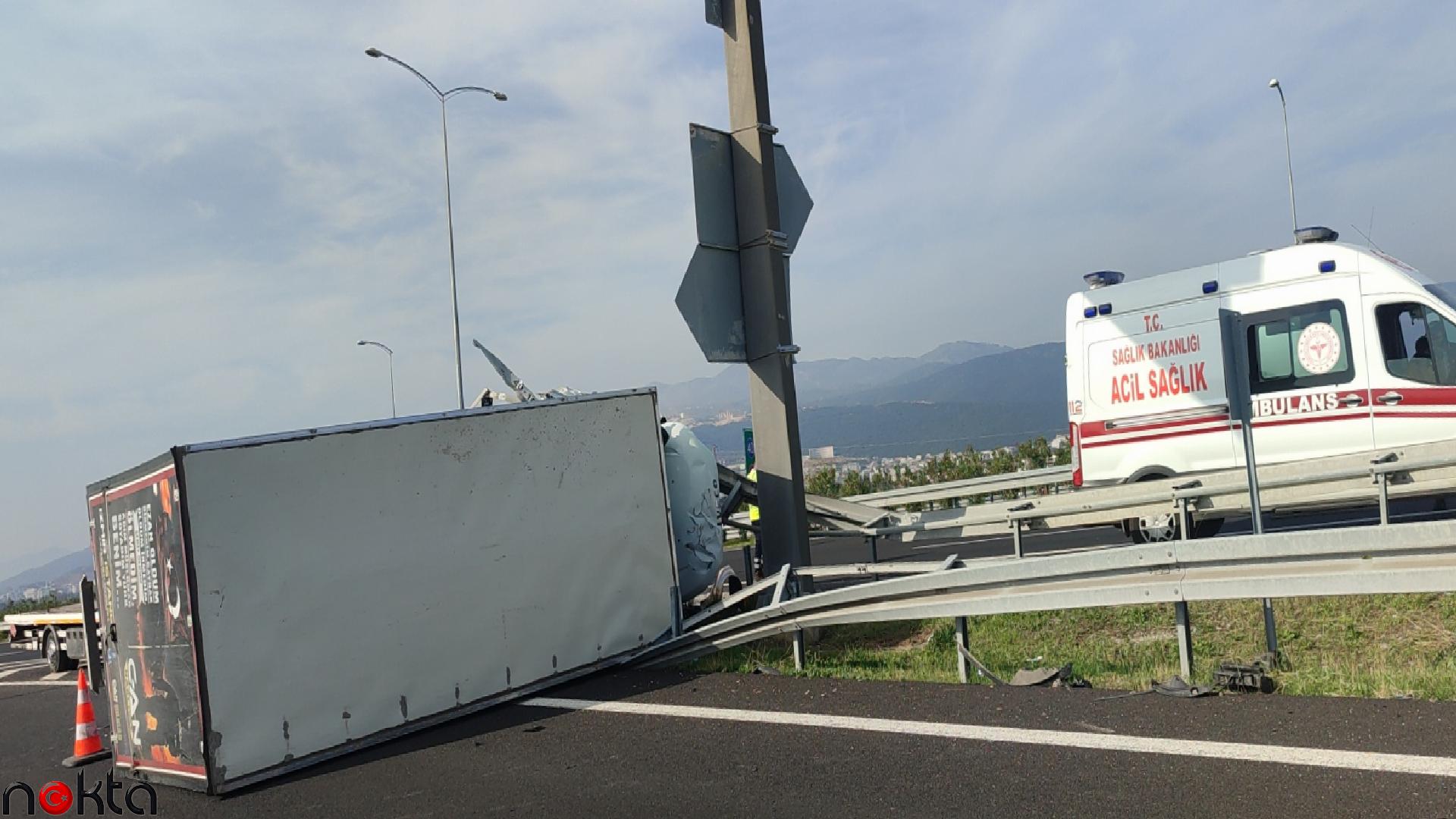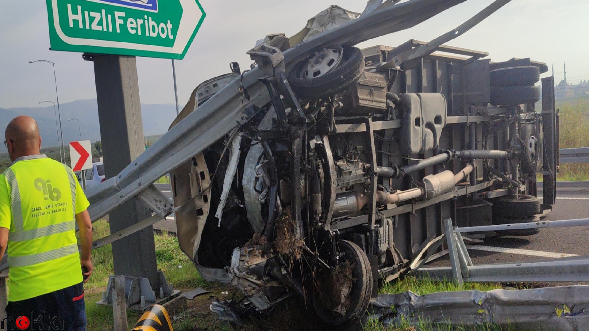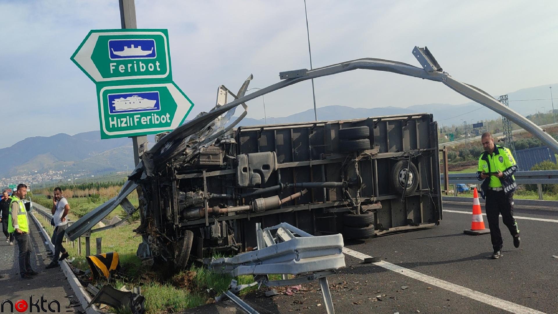 İstanbul-İzmir Otoyolu’nda seyreden Muhammet Şükrü Öztürk (38) idaresindeki 35 AVC 716 plakalı kamyonet, Orhangazi Kavşağı’nda yön levhalarının bulunduğu bölümü yoldan ayıran bariyere çarpıp parçalayarak devrildi.