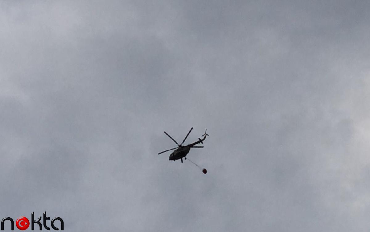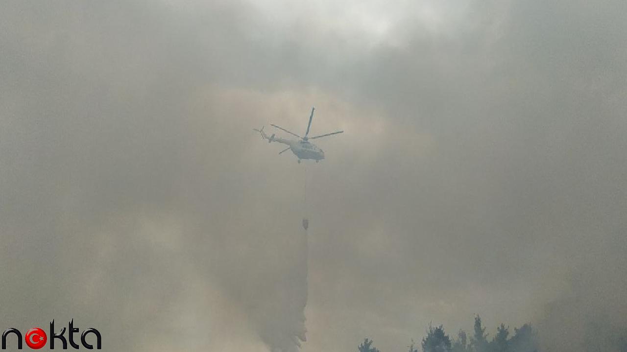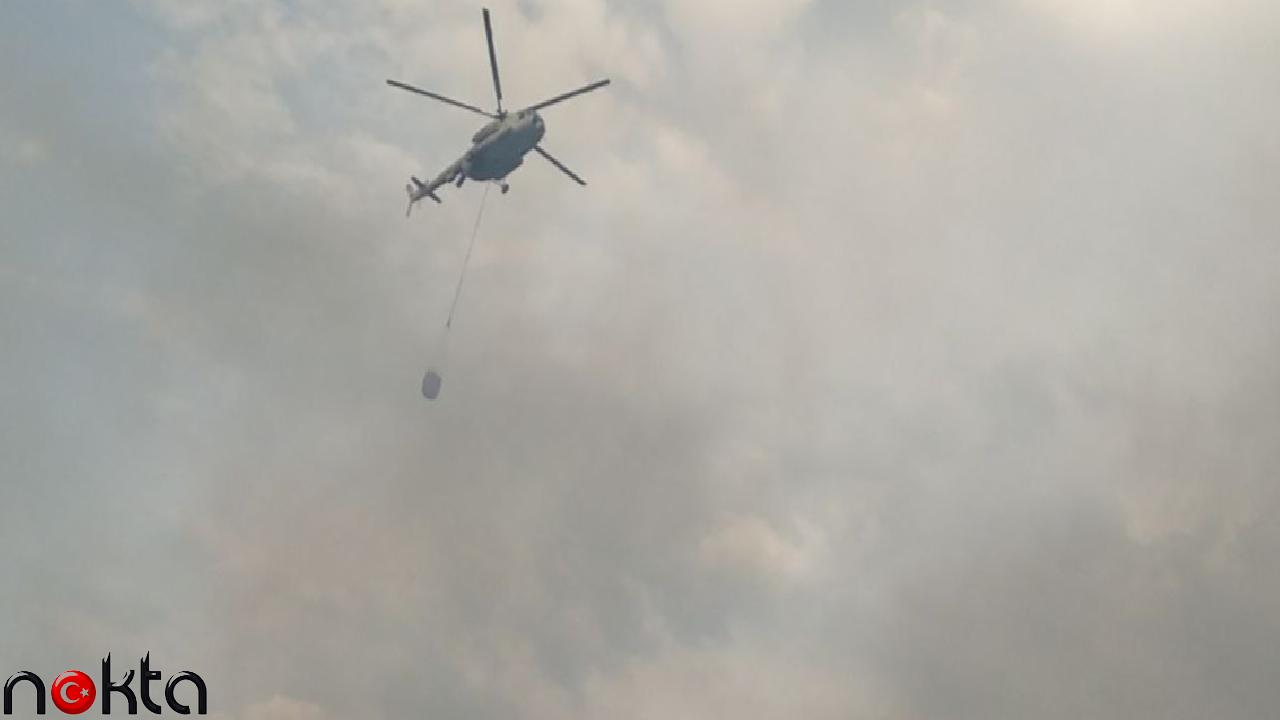 Zaman zaman şiddetli rüzgarın etkili olduğu bölgede arazözler ve diğer araçlarla yürütülen söndürme çalışmasına havadan iki helikopter ve bir uçakla destek veriliyor.