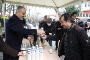 Başkan Aktaş, daha sonra Murat Hüdavendigar Camii önünde vatandaşlara salep ikram edip. onlarla sohbet etti.