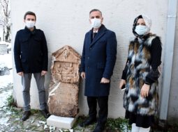 Bursa‘da, istinat duvarı için kazı yapılan alanda vatandaşın dikkati sayesinde bulunan ve Roma dönemine ait olduğu tahmin edilen mezar steli koruma altına alındı. İl Kültür ve Turizm Müdürü Kamil Özer (ortada) ile Bursa Müze Müdürü Çiğdem Durakoğlu (sağda), mezar stelini fark eden Erdoğan Tunaboylu’yu (solda) Arkeoloji Müzesi’nde konuk etti.
