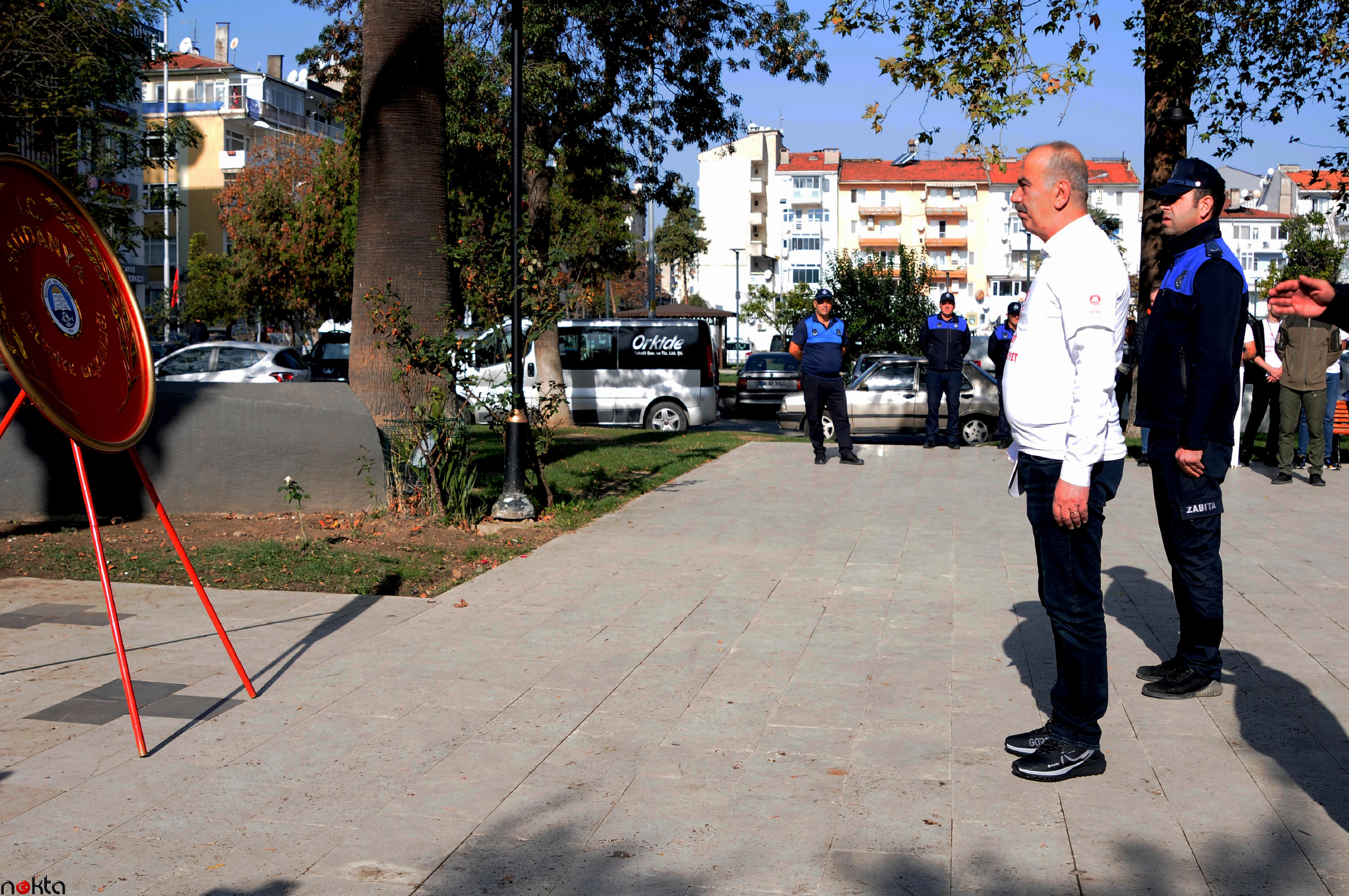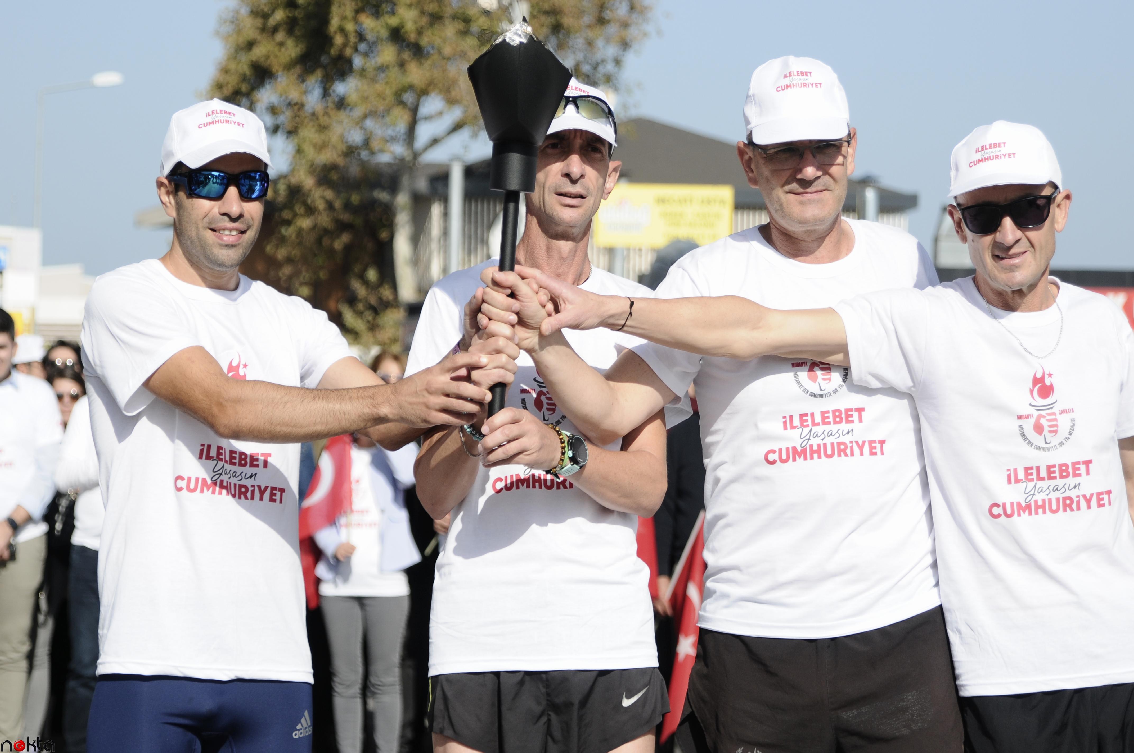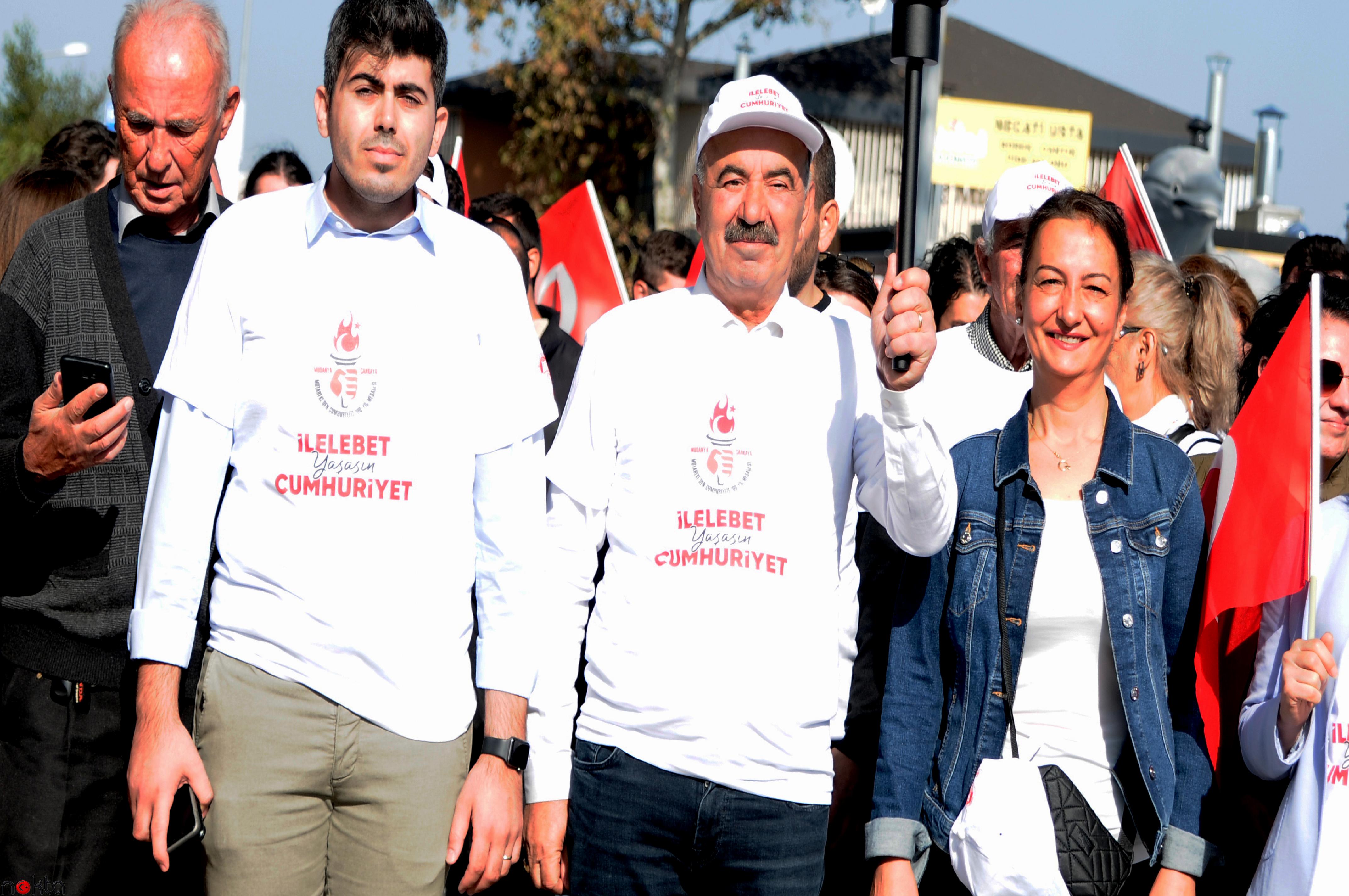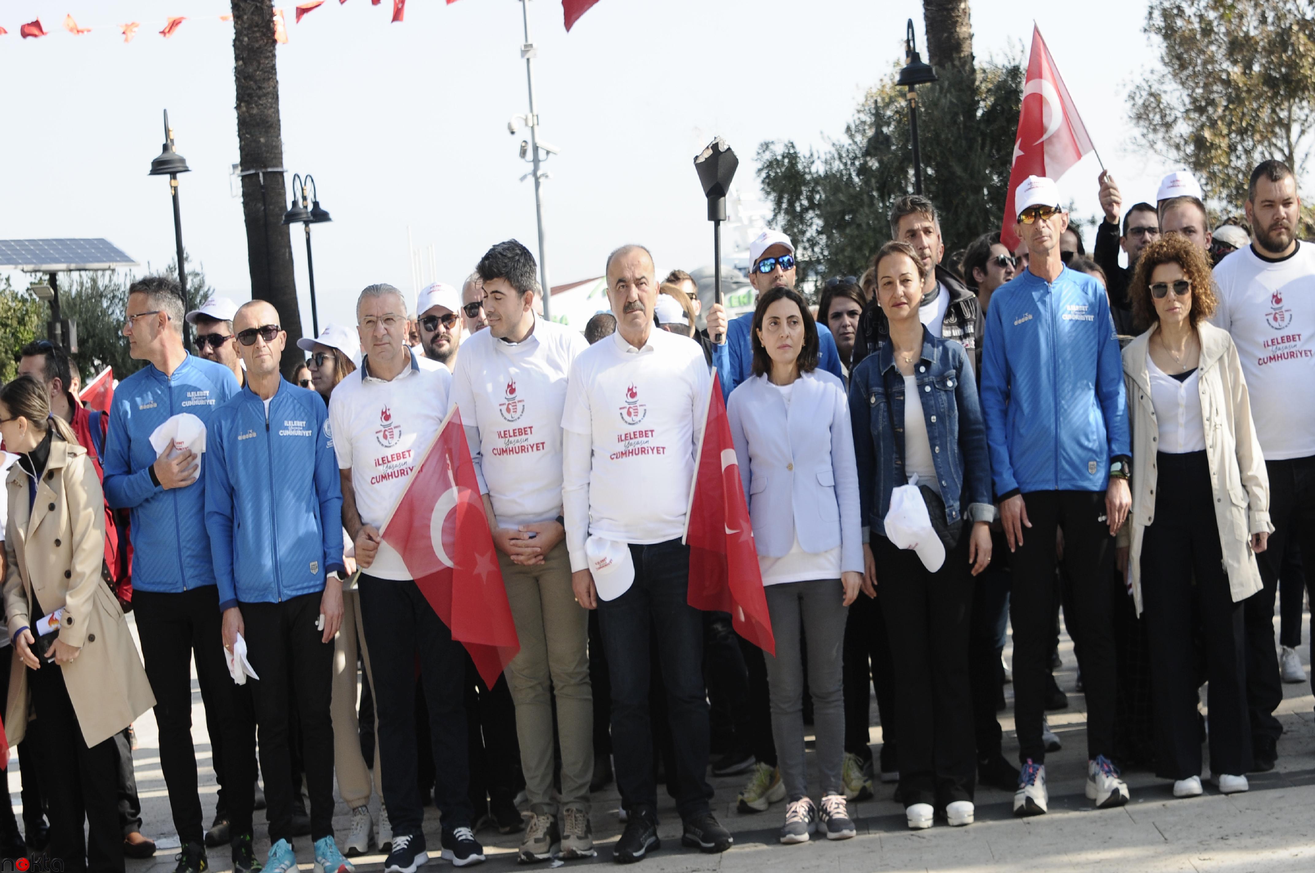 İskele Meydanı’ndaki Atatürk Anıtı’na çelenk bırakılmasının ardından Türkyılmaz ve beraberindekiler, meşale taşıyan sporcularla yürüyüşe geçti.
