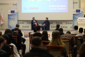 ‘Birlikte güçlüyüz’ sloganıyla gerçekleştirilen etkinliğin moderatörlüğünü yapan BTSO Genel Sekreter Yardımcısı ve Bursa AB Bilgi Merkezi Koordinatörü Hasan Erdem, açılış konuşmasında “AB’nin sunduğu ayrıcalıklı eğitim fırsatlarını üniversite hazırlığında olan gençlerimiz yakından takip etmeli. Yurt dışında eğitim olanaklarını araştırmaya başlamak, ilk adımı atmaktır. Gençlerimizin kariyer planlamasında önemli bir yer tutacak bu adım, geleceklerini şekillendirme noktasında ışık tutacaktır. AB Bilgi Merkezi olarak bizler de etkinliklerle öğrencilerimizin yanında olmaya devam edeceğiz.” ifadelerini kullandı.