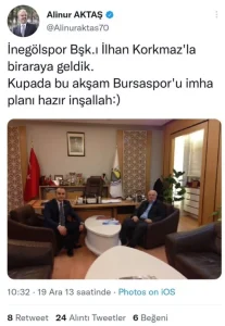 Bursa Büyükşehir Belediye Başkanı AKP’li Alinur Aktaş, Bursaspor’un 2-1 kaybettiği Göztepe maçı sonrası twitter adresinden bir tweet attı.