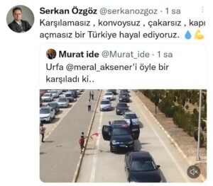 Özgöz, Meral Akşener’I hedef alan paylaşımında “Karşılamasız, konvoysuz, çakarsız, kapı açmasız bir Türkiye hayal ediyoruz.” dedi, bir süre sonra paylaşımını sildi.