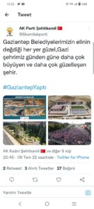 Deva Partisi’nin Gaziantep Mitingi görüntülerini Ak Parti kendi gibi paylaşmış Ali Babacan’ı Gaziantep’te düzenlediği mitingin havadan çekilen görüntülerinde sahanın dolu olması dikkat çekti. AK Parti Şehitkamil İlçe Başkanlığı ”GaziantepYaptı” etiketine Deva Partisi Gaziantep Mitingine ait görüntüleri kullandığı ortaya çıktı. Demokrasi ve Atılım Partisi (DEVA) Gaziantep Kurucu İl Başkanı Avukat Ertuğrul Kaya, AK Parti Şehitkamil İlçe Başkanlığı ”GaziantepYaptı” etiketine Deva Partisi Gaziantep Mitingine ait görüntüleri kullandığı ortaya çıkınca Ak Partiyi alaya aldı.