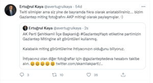 Demokrasi ve Atılım Partisi (DEVA) Gaziantep Kurucu İl Başkanı Avukat Ertuğrul Kaya, AK Parti Şehitkamil İlçe Başkanlığı ”GaziantepYaptı” etiketine Deva Partisi Gaziantep Mitingine ait görüntüleri kullandığı ortaya çıkınca Ak Partiyi alaya alarak