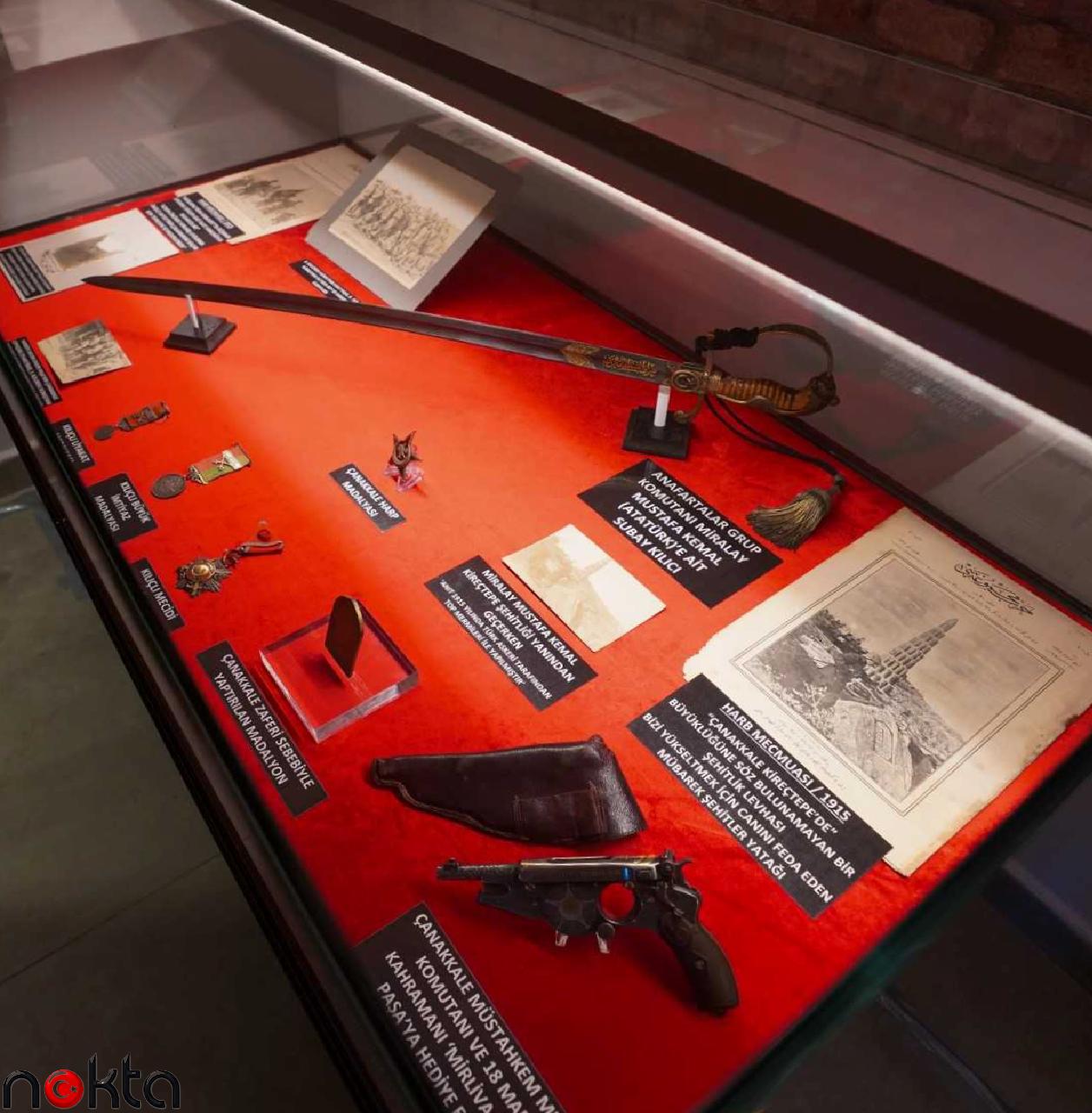 Sergide, Atatürk’ün yanı sıra Çanakkale Müstahkem Mevkii Komutanı Cevat Paşa’ya ait tabanca ve Mayın Grup Komutanı Hafız Nazmi Bey’e ait subay kılıcı, fotoğraf ve belgeler, Kurtuluş Savaşı dönemi afişleri, objeler ve canlandırmalardan oluşan 100’den fazla eser sergileniyor.