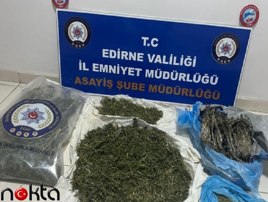 Evinde 1 kilo 194 gram esrar ele geçirilen şüpheli gözaltına alındı. İ.K. emniyetteki işlemlerinin ardından Edirne Adliyesi’ne getirildi.