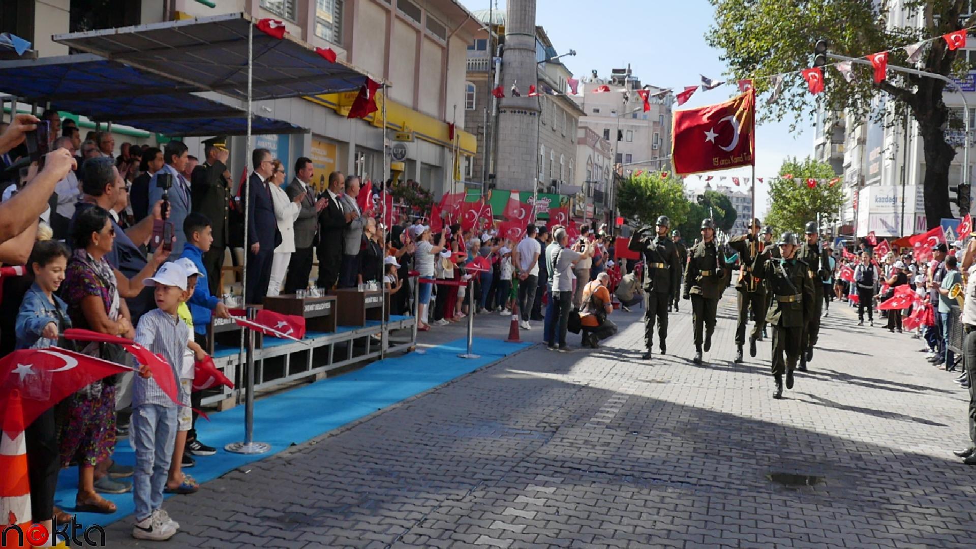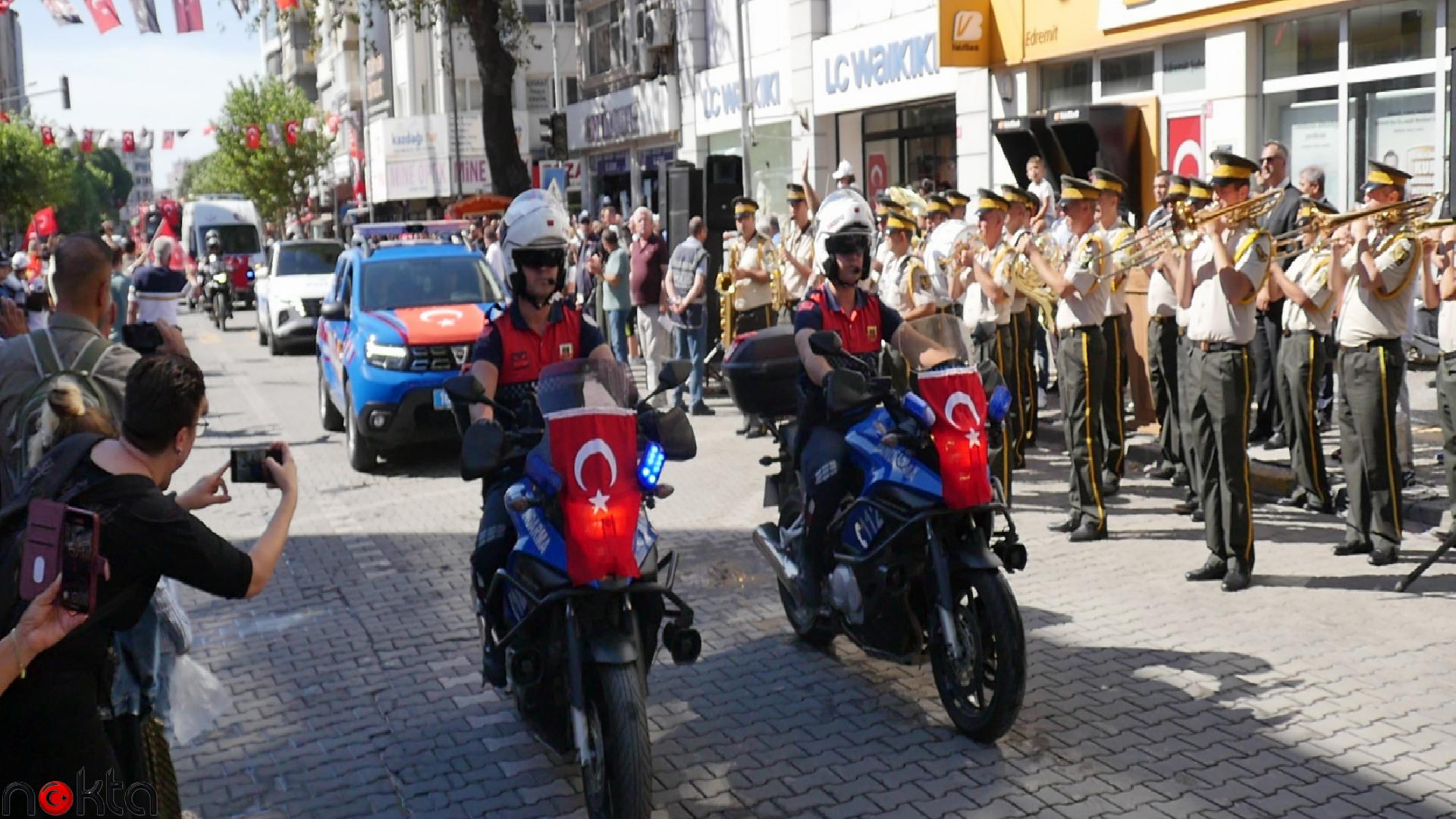 Menderes Bulvarı’ndaki resmigeçide ise askerler, öğrenciler, sivil toplum kuruluşları, dernekler, meslek odaları, Balıkesir Büyükşehir Belediyesi ve Edremit Belediyesi grupları katıldı. Jandarma ve polis grupları de araçlarıyla geçit merasimine renk kattı.