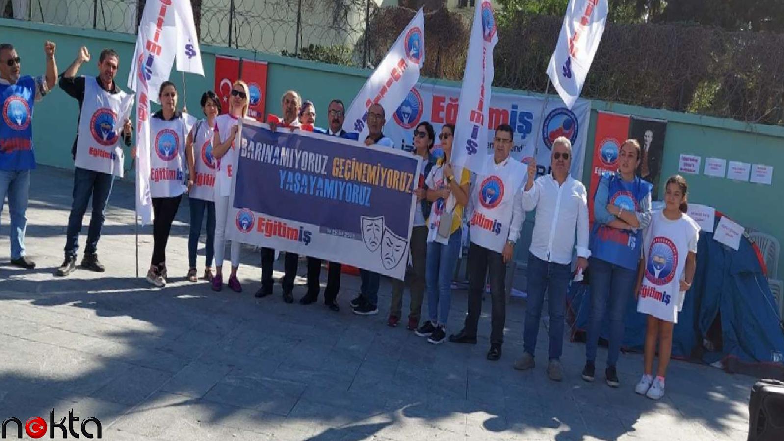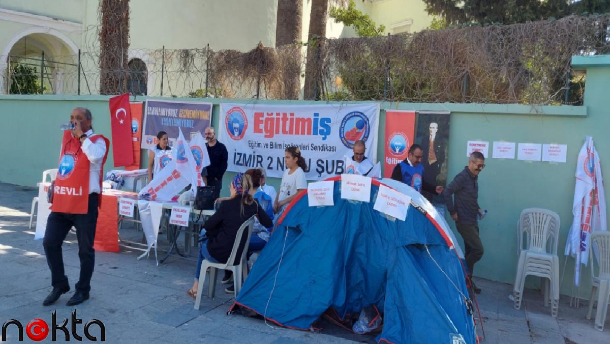 Eğitim-İş üyesi öğretmenler, barınma ve özlük hakları gibi sorunlara dikkat çekmek için İzmir’de Bornova Cumhuriyet Meydanı’na kamp çadırı kurdu. Hakları için 24 Kasım Öğretmenler Günü’nde iş bırakacaklarını söyleyen Eğitim İş Genel Mali Sekreter Hüseyin Selçuk, müftülüklerle yürütülen ÇEDES projesinin iptal edilmesini talep etti. Selçuk, “Haklarımız gasp ediliyor” dedi.