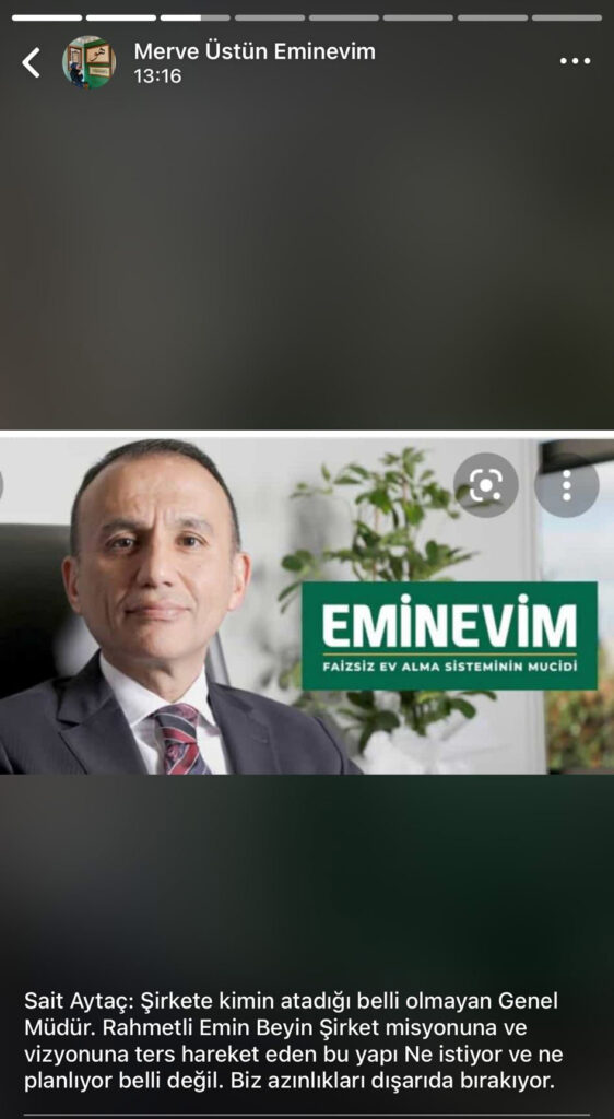 “Şirkete kimin atadığı belli olmayan Genel Müdür. Rahmetli Emin Bey’in şirket misyonuna ve vizyonuna ters hareket eden bu yapı ne istiyor ve planlıyor belli değil. Biz azınlıkları dışarıda bırakıyor.”