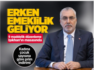 EKONOMİ – Erken emeklilik için düğmeye basılıyor! Memur ve emekli maaşı zammının belirlendiği ilk torba yasanın Meclis’ten geçmesinin ardından daha geniş kapsamlı ikinci bir torba yasa için adım atılıyor. Bu kapsamda Çalışma ve Sosyal Güvenlik Bakanı Vedat Işıkhan’ın masasında bekleyen çok sayıda dosya daha bulunuyor. Memurların 3600 ek gösterge artışından, SGK ve Bağ-Kur prim eşitlemesine, kadınların erken emekliliğinden, taşeron sorununa kadar bir çok konu bu ikinci torba yasada yer alacak.