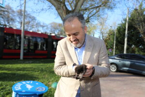 Reşat Oyal Kültür Parkı girişindeki yeşil alana yerleştirilen kedi evlerini inceleyen Büyükşehir Belediye Başkanı Alinur Aktaş,