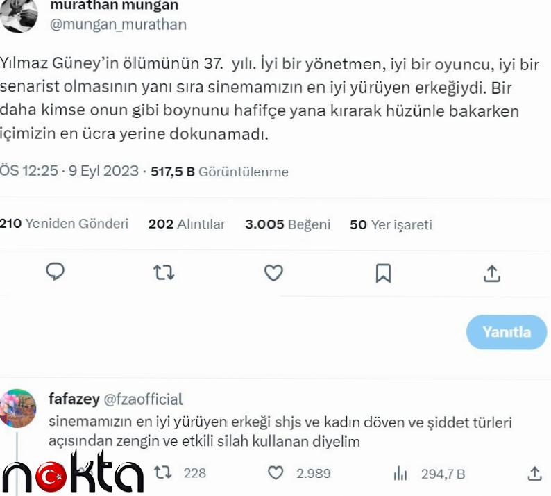 9 Eylül 1984’te hayatını kaybeden oyuncu, yönetmen ve senarist Yılmaz Güney’in ölüm yıl dönümü vesilesiyle yazar Murathan Mungan X hesabından “Yılmaz Güney’in ölümünün 39. yılı. İyi bir yönetmen, iyi bir oyuncu, iyi bir senarist olmasının yanı sıra sinemamızın en iyi yürüyen erkeğiydi. Bir daha kimse onun gibi boynunu hafifçe yana kırarak hüzünle bakarken içimizin en ücra yerine dokunamadı” paylaşımını yaptı.