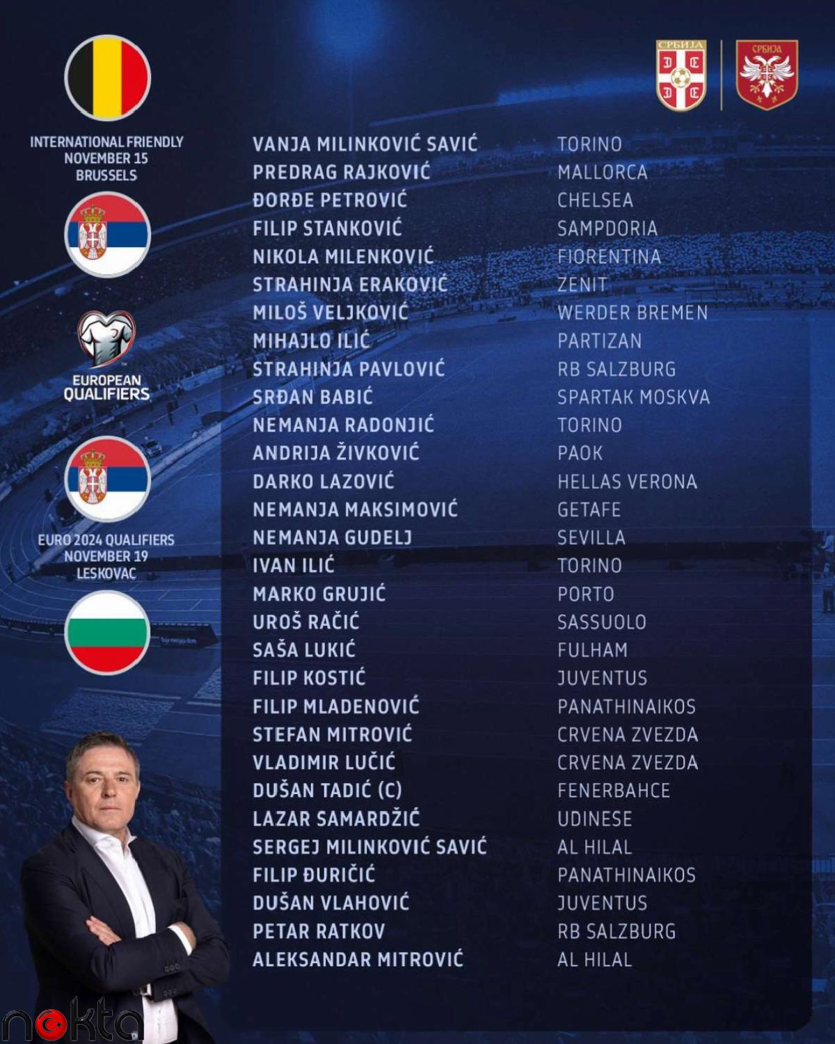 Sırbistan’ın kaptanlığınıda yapan Dusan Tadic, Bulgaristan ile oynanacak EURO 2024 Elemeleri ve Belçika ile yapılacak hazırlık maçları için 32 kişilik aday kadroda kendisine yer buldu.