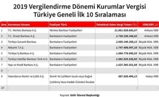 Kurumlar vergisi beyan eden mükellef listesinde ise ilk sıranın sahibi tahakkuk ettirilen 11 milyar 51 milyon 920 bin 642 lira vergiyle Türkiye Cumhuriyet Merkez Bankası (TCMB) oldu. TCMB’yi Ziraat Bankası ve Garanti BBVA takip etti.