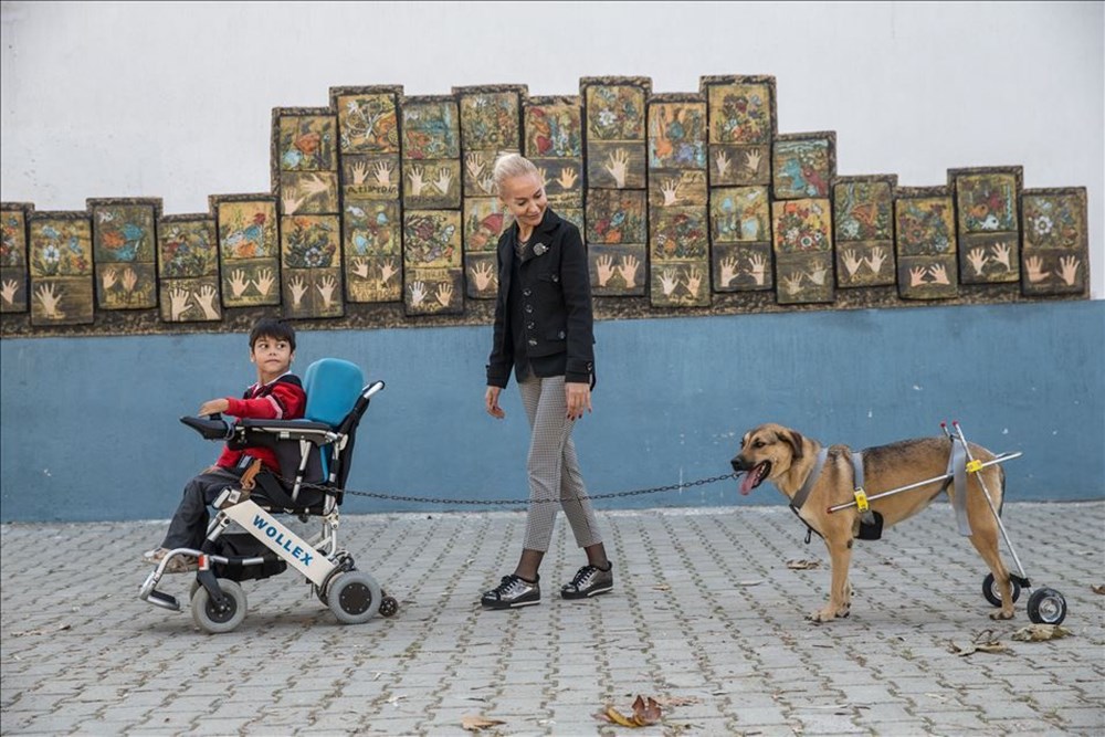 İzmir’de, aracın çarpması sonucu arka bacağı kopan “Fıstık” adlı köpek, öğretmen Mehmet Tanrıverdi’nin başlattığı çalışmayla protez yürütecine kavuştu. Güzelbahçe İlçe Milli Eğitim Müdürü Öznur Çetin de projede Tanrıverdi’ye destek verdi. ( Halil Fidan – Anadolu Ajansı )