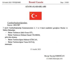 Buna göre; Hazine ve Maliye Bakanlığı Bakan Yardımcısı Şakir Ercan Gül ve Bakan Yardımcısı Mehmet Hamdi Yıldırım görevden alındı. Yerlerine Mahmut Gürcan ve Yunus Elitaş atandı.