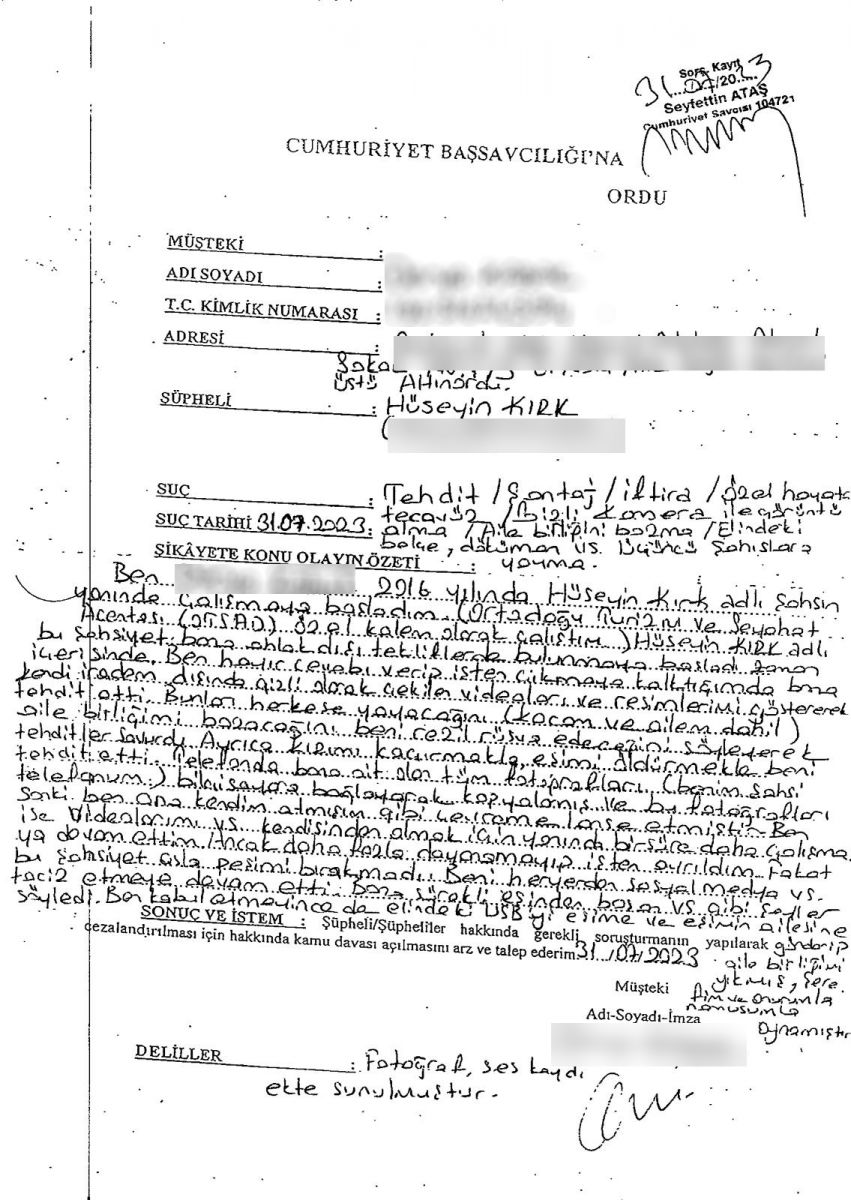 Hüseyin Kırk hakkında 31.07.2023 tarihinde Ordu Cumhuriyet Savcılığı’na müşteki sıfatı ile ifade veren D.U. 2016 yılında OTSAD’da Hüseyin Kırk’ın yanında özel kalem olarak çalışmaya başladığını, kendisine ahlak dışı tekliflerde bulunduğu zaman işten ayrılmak istediğini söylediğinde kendisini tehdit ettiğini ve iradesi dışında çekilen özel görüntülerini ve videolarını gösterip herkese yaymakla tehdit edildiğini belirterek şikayetçi oldu.