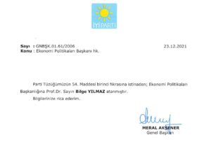 EKONOMİ – İYİ Parti Genel Başkanı Meral Akşener imzasıyla İYİ Parti Ekonomi Politikaları Başkanlığına Prof. Dr. Bilge Yılmaz getirildi.