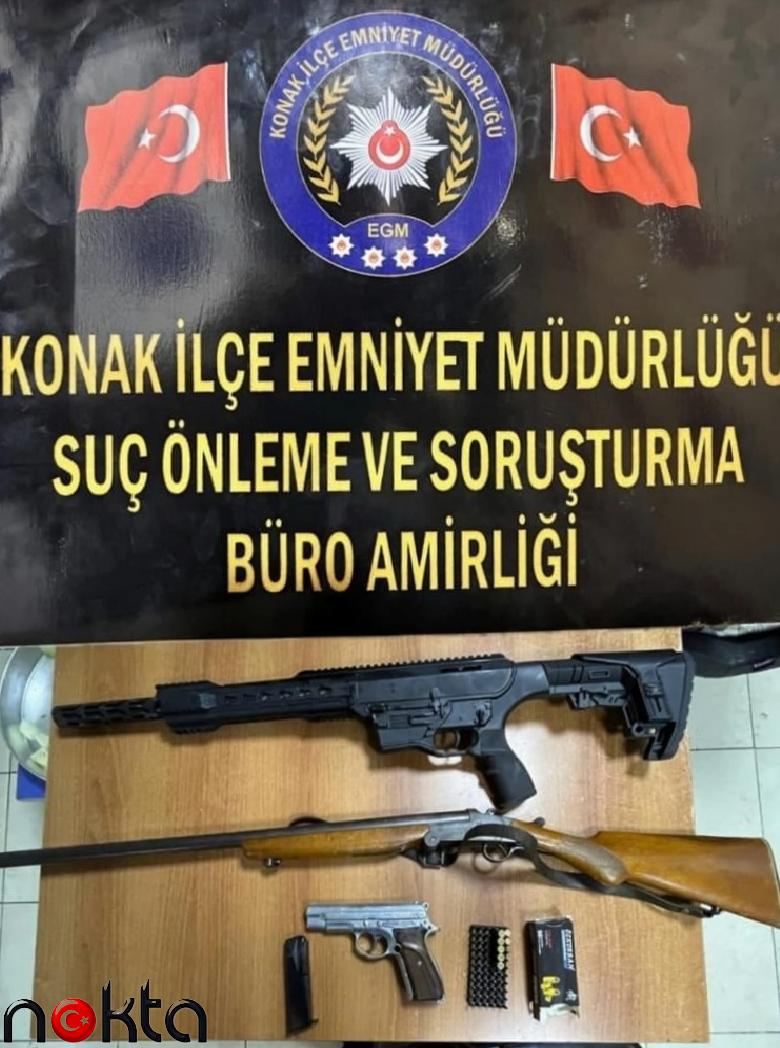 İzmir’in Konak ilçesinde, kaçak silah ve mühimmat ticareti yaptığı tespit edilen şüphelilere yönelik iki adrese yapılan eş zamanlı operasyonda çok sayıda tabanca, tüfek, silah yapımında kullanılan aparatlar ve suçtan elde edildiği belirlenen 186 bin lira ele geçirildi, gözaltına alınan 5 şüpheliden 4’ü tutuklandı.