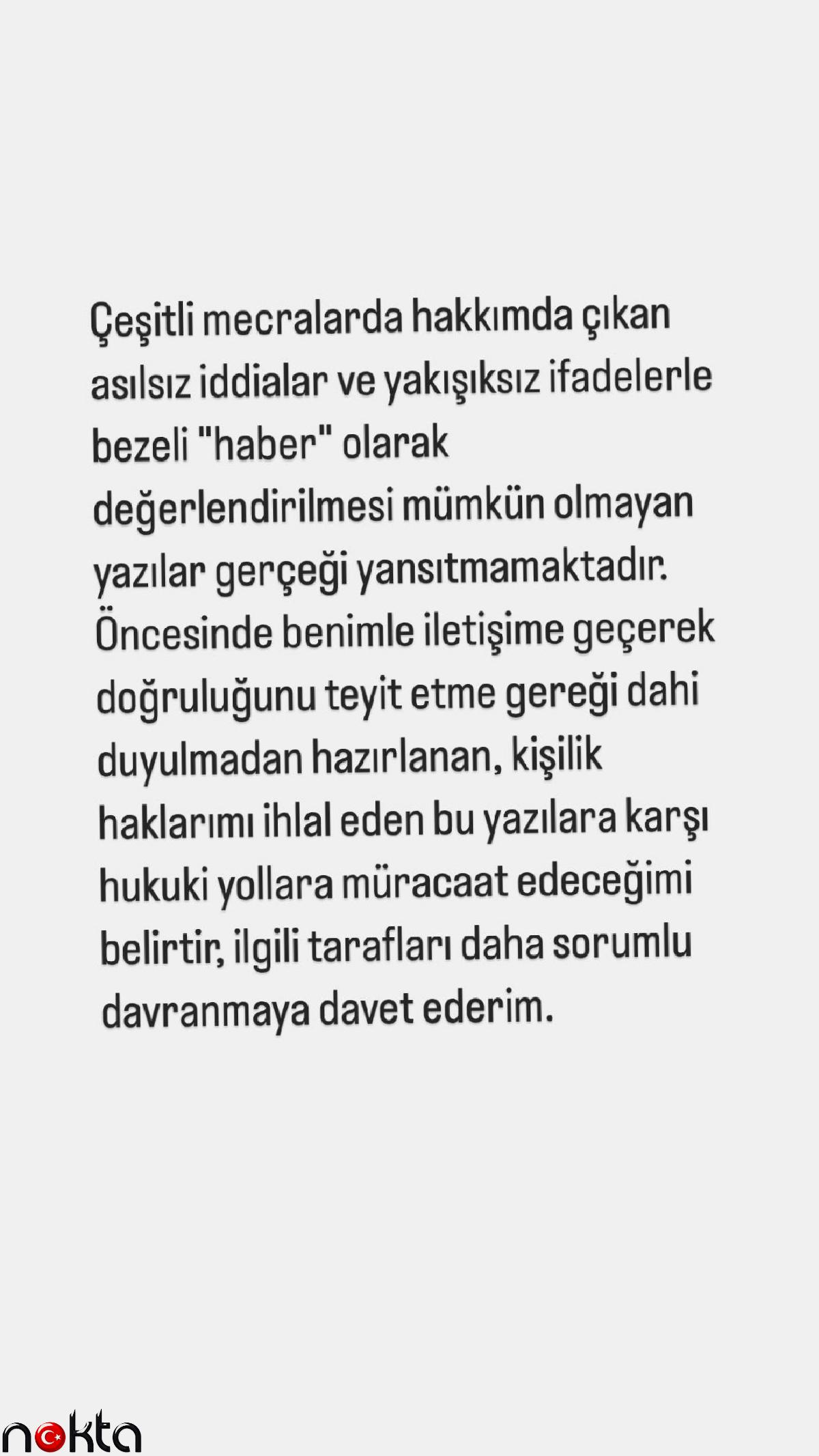 Instagram hesabından yazılı bir açıklama yapan oyuncu, “Çeşitli mecralarda hakkımda çıkan asılsız iddialar ve yakışıksız ifadelerle bezeli “haber” olarak değerlendirilmesi mümkün olmayan yazılar gerçeği yansıtmamaktadır. Öncesinde benimle iletişime geçerek doğruluğunu teyit etme gereği dahi duyulmadan hazırlanan, kişilik haklarımı ihlal eden bu yazılara karşı hukuki yollara müracaat edeceğimi belirtir, ilgili tarafları daha sorumlu davranmaya davet ederim” ifadelerini kullandı.