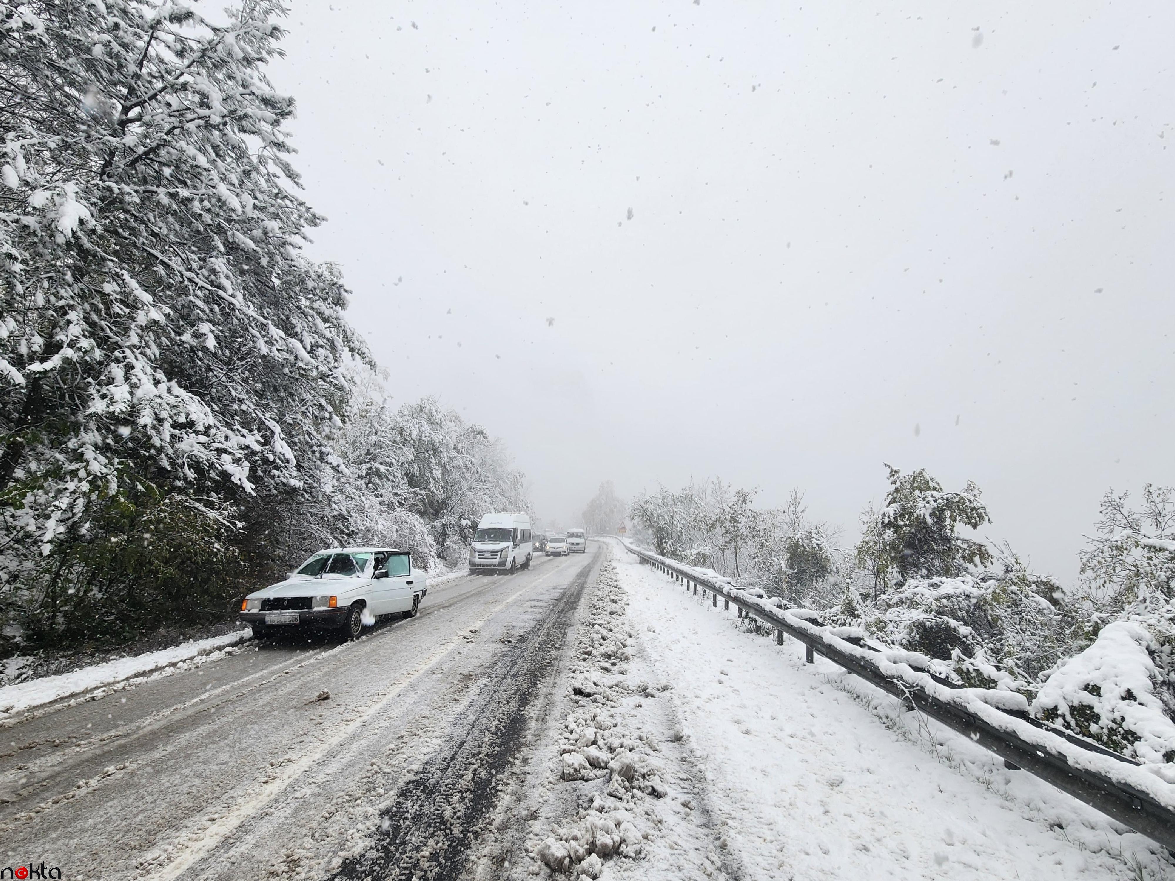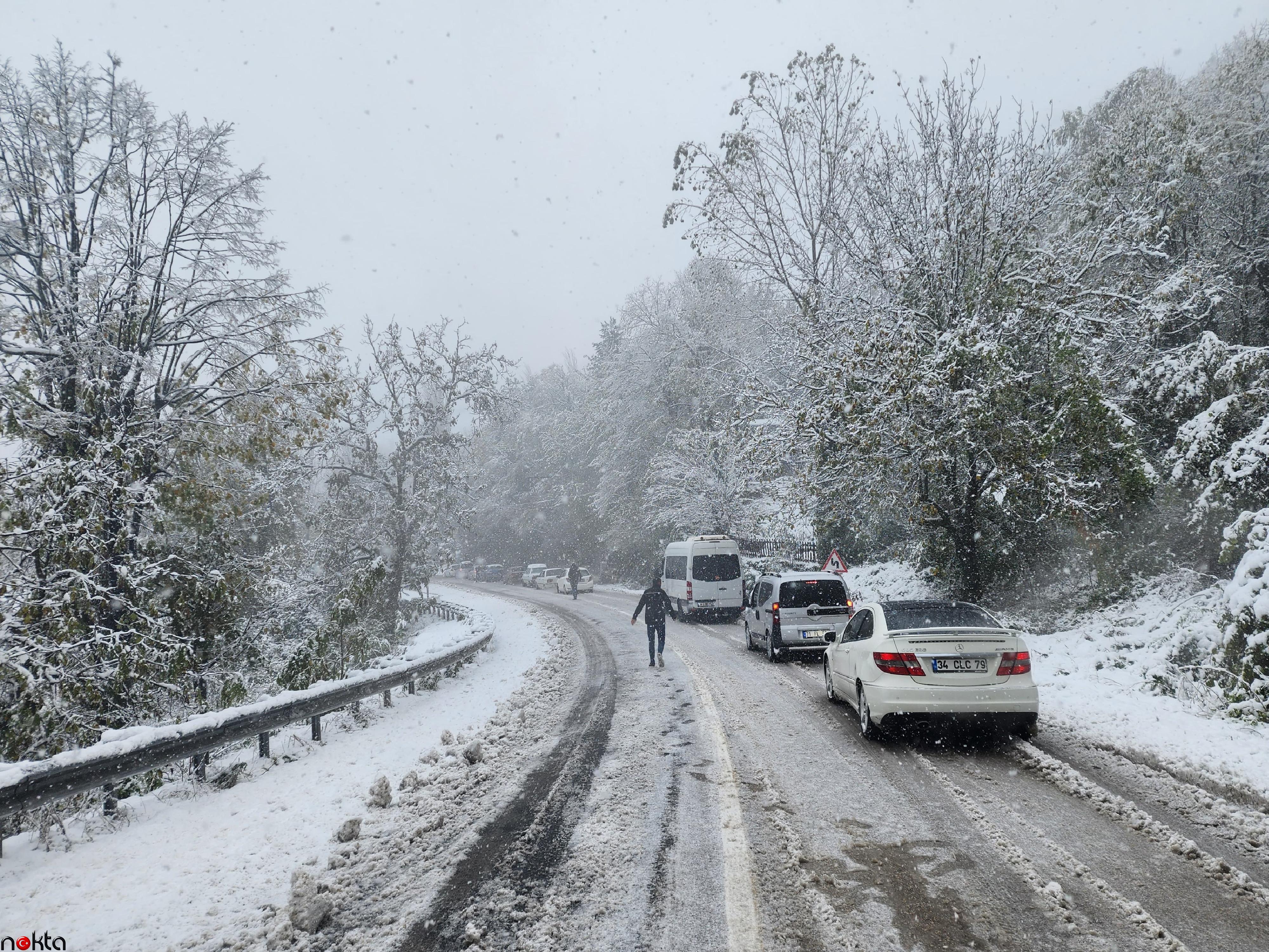 Trafiğin zaman zaman durduğu ve araç kuyruklarının oluştuğu kara yolunda ulaşım güçlükle sağlanıyor.