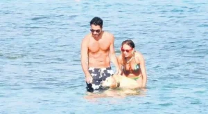 Ancak denize baş başa değil üç kişi olarak girdiler. Güzel oyuncunun köpeği de yeni çifti yalnız bırakmadı.