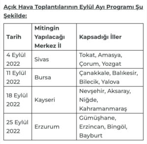 MHP’den yapılan açıklamaya göre, 4 Eylül günü Sivas’ta Tokat, Amasya, Çorum ve Yozgat’ı kapsayan ilk 5 illi bölge mitingi yapılacak. 11 Eylül’de Bursa’da, Çanakkale, Balıkesir, Bilecik ve Yalova’yı kapsayan 5 illi ikinci bölge mitingini yapılacak. 18 Eylül’de Kayseri’de Nevşehir, Aksaray, Niğde, Kahramanmaraş’ı kapsayan 3’üncü 5 illi bölge mitingi yapılacak ve 25 Eylül’de Erzurum’da Gümüşhane, Bayburt, Erzincan ve Bingöl’ü kapsayan 4’üncü 5 illi bölge mitingleri düzenlenecek.