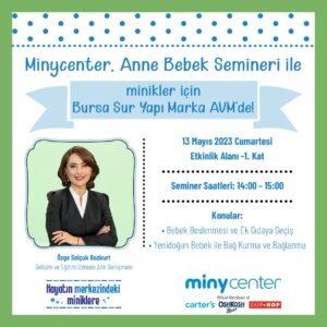Annelere her alanda destek olmayı amaçlayan Minycenter, 13 Mayıs Cumartesi günü saat 14:00 – 15:00 arasında Bursa Sur Yapı Marka AVM’de bir seminer düzenleyecek. Çocuk gelişim uzmanı Özge Selçuk Bozkurt’un konuşmacı olacağı seminerde ‘bebek beslenmesi, ek gıdaya geçiş’ ve ‘Yenidoğan bebek ile bağ kurma ve bağlanma’ konuları ele alınacak.
