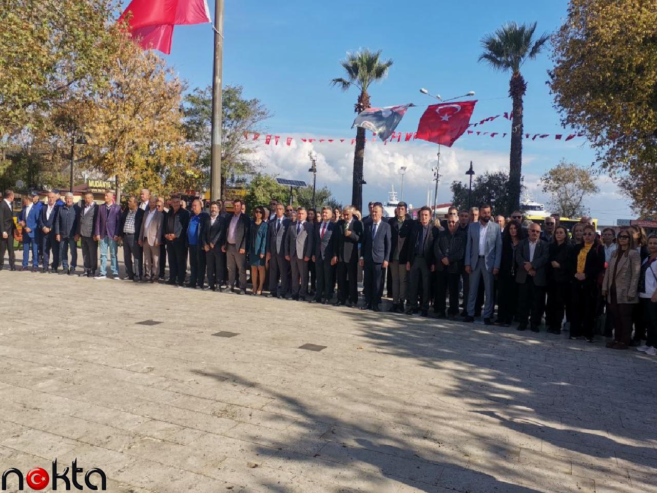 İskele Meydanı’ndaki törende Atatürk Anıtı’na çelenk bırakıldı, saygı duruşunda bulunuldu ve İstiklal Marşı okundu.