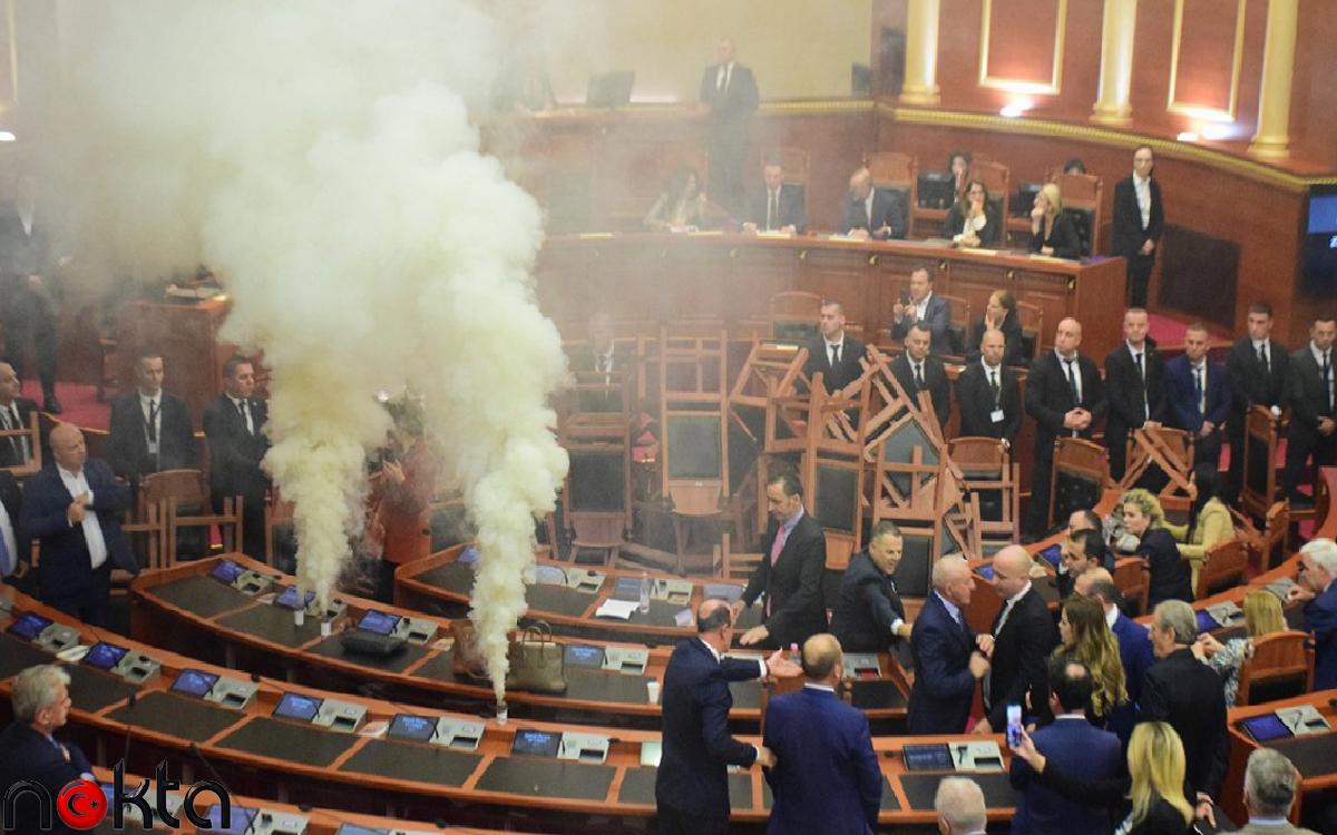 Arnavutluk’ta sıradışı bir eylem daha gerçekleşti. Daha önce de farklı yöntemlerle meclis oturumlarını engelleyen muhalefet milletvekilleri, bugünkü oturumda daha önce olduğu gibi çalışmaları engellemek için sandalyeleri kürsünün önüne yerleştirip sis bombası attı.