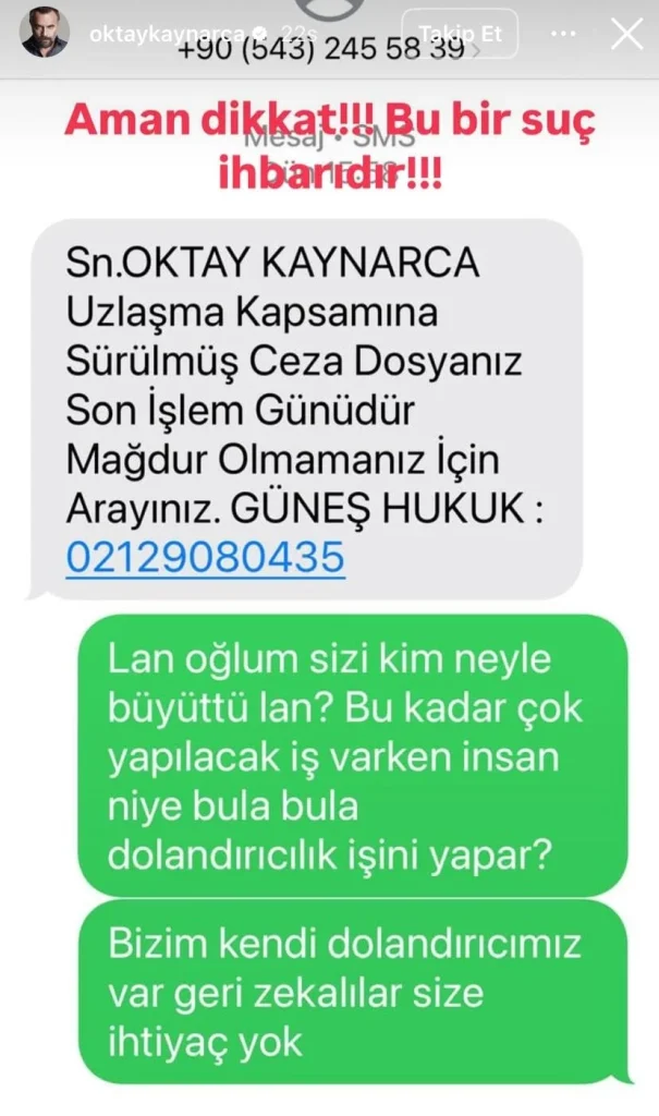 Ünlü oyuncu Oktay Kaynarca, telefonuna gelen şüpheli bir mesaj nedeniyle büyük tepki gösterdi. İddiaya göre bir hukuk bürosuna ait olduğu öne sürülen numaradan Kaynarca’ya bir ceza davasının bulunduğu yönünde mesaj gönderildi. Mesajda, mağdur olmaması için ilgili numarayla iletişime geçmesi gerektiği ifade edildi.