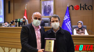 Bursa’da yıllardır topladığı mavi kapaklarla öğrencilere burs ve çeşitli derneklere destek sağlayan ve bu davranışı basına yansıyan Nazmi Gökçe de ayın vatandaşı olarak plaketini Yenişehir Belediye Başkanı Davut Aydın’ın elinden aldı.