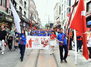 Sadi Etkeser İlkokulu öğrencilerinin bando ve halk oyunları gösterisinin ardından marşlar eşliğinde kortej yürüyüşüne geçildi. Başkan Erkan Aydın, çocuklar ve aileleriyle birlikte Zafer Plaza Meydanı’ndan Cumhuriyet Caddesi boyunca çocuk bandosu eşliğinde marşlar söyleyip, ay yıldızlı bayrakları sallayarak coşkulu bir yürüyüş gerçekleştirdi. Esnaf ve vatandaşların da büyük ilgi gösterdiği kortej yürüyüşü Abdal Meydanı’nda son buldu.