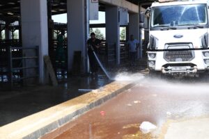BURSA – Osmangazi’de kurban pazarları temizlendi Kurban Bayramı boyunca ilçede kurulan kurban kesim ve satış noktalarının hijyenik olması için yoğun temizlik çalışması gerçekleştiren Osmangazi Belediyesi ekipleri, bayramın birinci gününden itibaren hayvan pazarları ve kesim alanlarında oluşan hayvan atıklarını temizlemeye başladı. Veysel Karani ve Geçit kurban pazarında bayramın ilk gününden itibaren temizlik çalışmalarını aralıksız sürdüren Osmangazi Belediyesi Temizlik İşleri Müdürlüğüne bağlı 40 kişilik ekip her gün hayvan atıklarını süpürüp, yerleri tazyikli suyla yıkayarak, pazar alanlarını dezenfekte etti. Fen İşleri Müdürlüğü’ne bağlı 40 kişilik ekip ise 10 kamyon ve 6 iş makinesiyle pazar alanlarında biriken hayvan atıklarını temizledi. Bayramın son gününden itibaren kurban pazarlarında başlayan temizlik çalışmaları ile bu noktalar günlük yaşama uygun hale getirilecek.