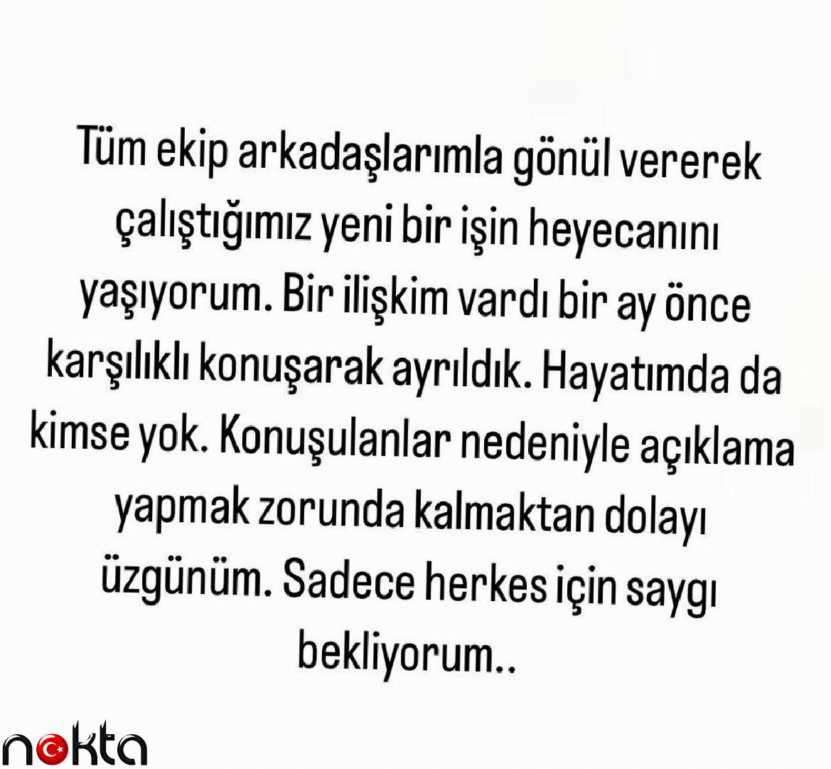 Söylentilerin ardından Özge Yağız, Instagram hesabından yaptığı paylaşımda “Tüm ekip arkadaşlarımla gönül vererek çalıştığımız yeni bir işin heyecanını yaşıyorum. Bir ilişkim vardı bir ay önce karşılıklı konuşarak ayrıldık. Hayatımda da kimse yok. Konuşulanlar nedeniyle açıklama yapmak zorunda kalmaktan dolayı üzgünüm. Sadece herkes için saygı bekliyorum” ifadelerini kullandı.