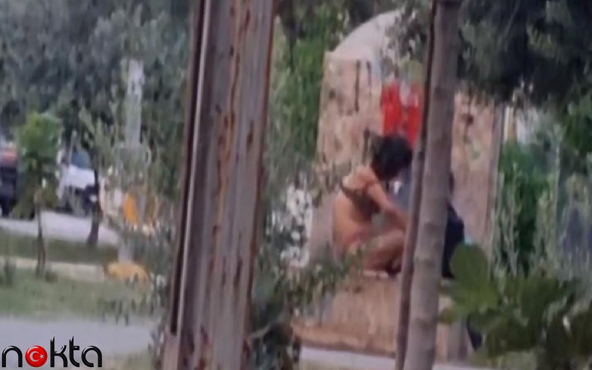 İç çamaşırlarıyla kalan kadın, çeşmede banyo yaptı. Bu anlar parka gelen bir vatandaş tarafından cep telefonu kamerasıyla kayda alındı.