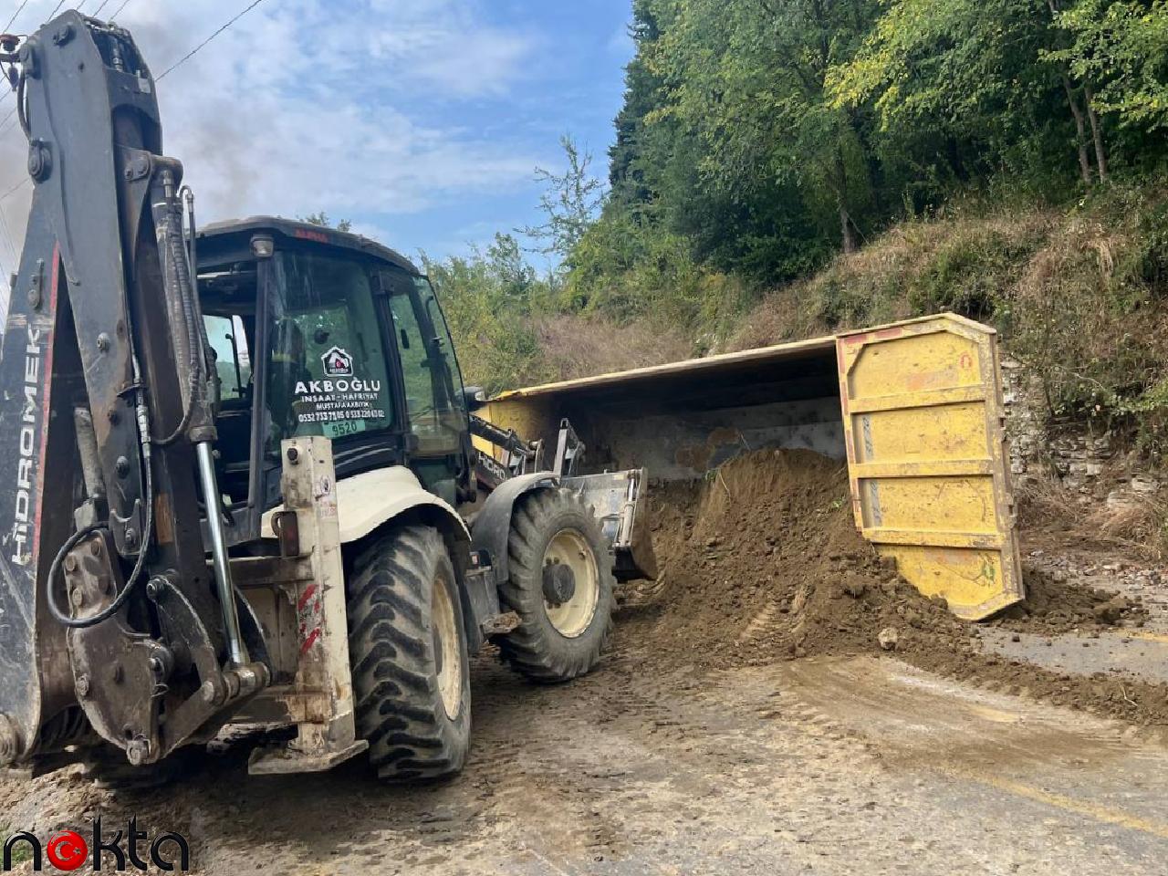 Trafiğin tek şeritten kontrollü sağlandığı güzergahta, kamyon ve yola dökülen toprağın kaldırılması için çalışma başlatıldı.